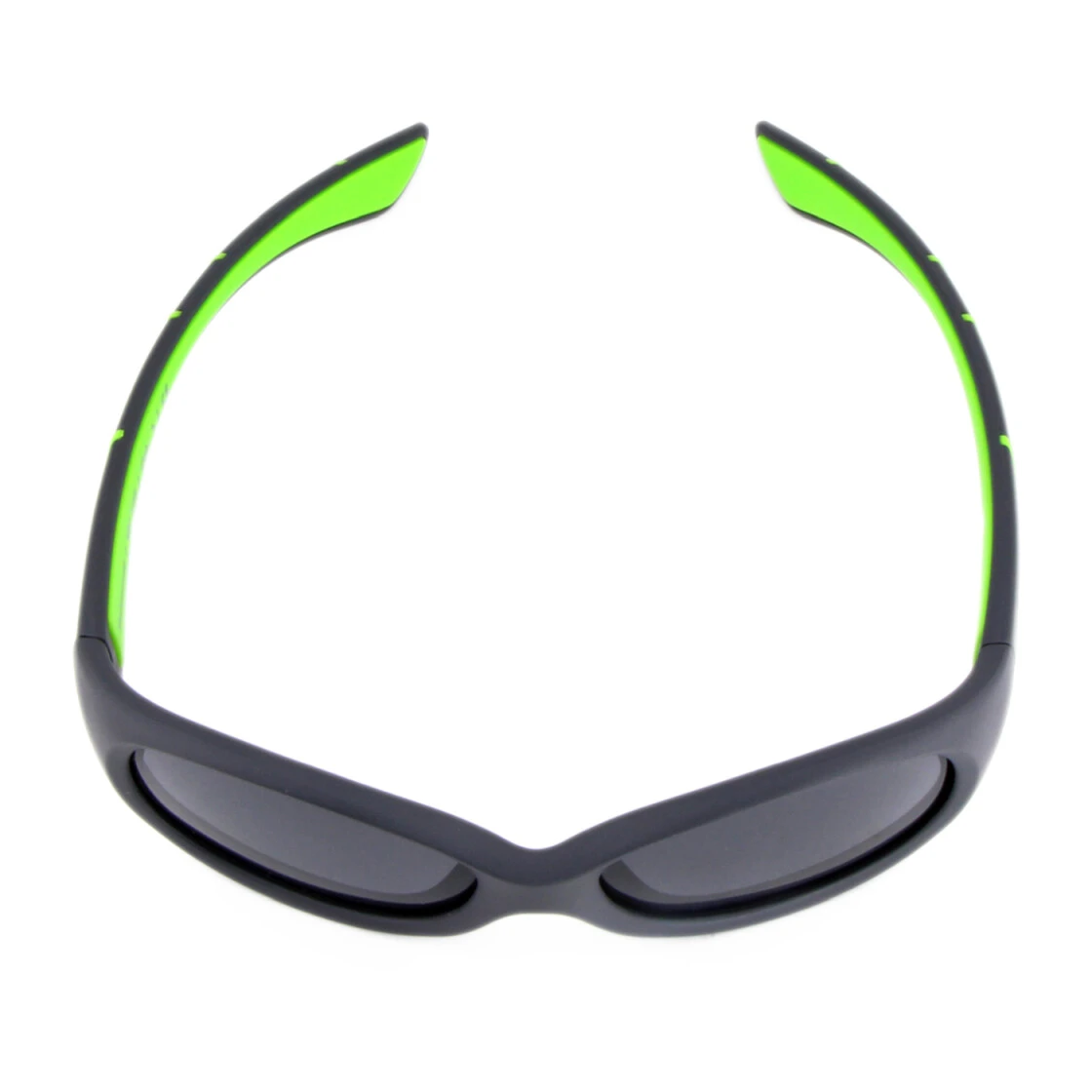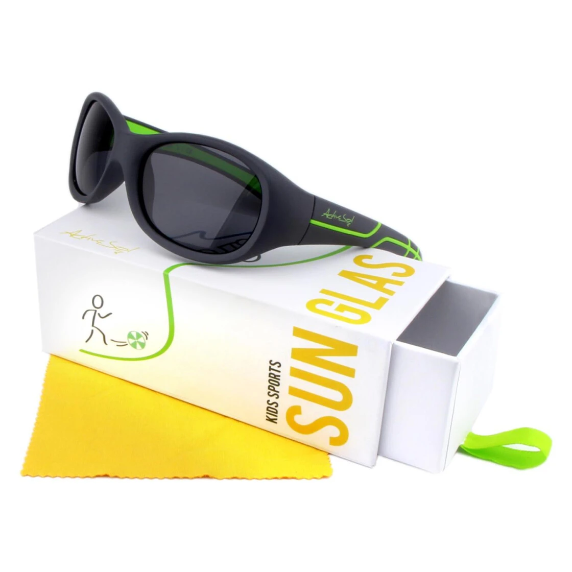 Die Sonnenbrille speziell für Kinder. Sie sieht nicht nur gut aus, sondern entspricht auch höchsten Sicherheits- und Qualitätsstandards. Die Gläser filtern UV-Licht mit einer Wellenlänge bis zu 400 nm vollständig aus, so dass keine gefährlichen UV-A, UV-B oder UV-C Strahlen an das Auge gelangen. Zwischen 8 % und 18 % des Lichtes kann die Brille passieren. Dies entspricht der Filterkategorie 3 zum Schutz vor starker Sonnenstrahlung. Die Linsen sind polarisiert. Dies bedeutet, dass zum einen Spiegelungen deutlich reduziert werden – beispielsweise auf dem Wasser – und zum anderen sich der Kontrast erhöht, wodurch Konturen und Farben klarer und deutlicher werden. Das ungiftige High-Tech-Material Hyrtel® ist praktisch unzerstörbar und passt sich gut und flexibel der Kopfform an. Mit verstellbarem und abnehmbarem Kopfband, Schiebeschachtel und Putztuch.