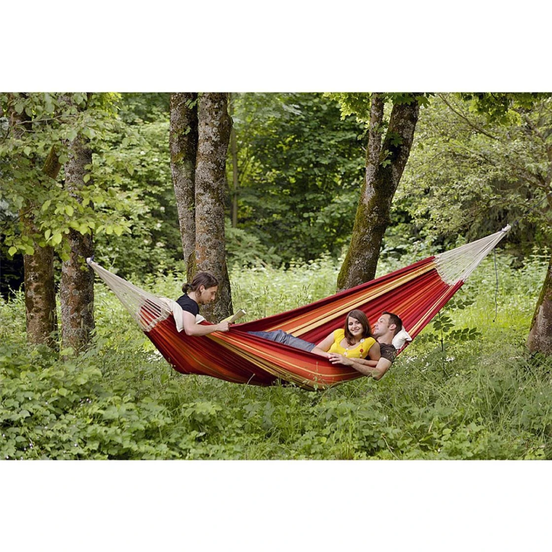 Die wahrscheinlich größte Hängematte der Welt. Mit 6.000 Baumwollfäden und 6 qm ergibt sich eine riesige Liegefläche aus extra fest gewebtem Stoff. Gigantisch!
