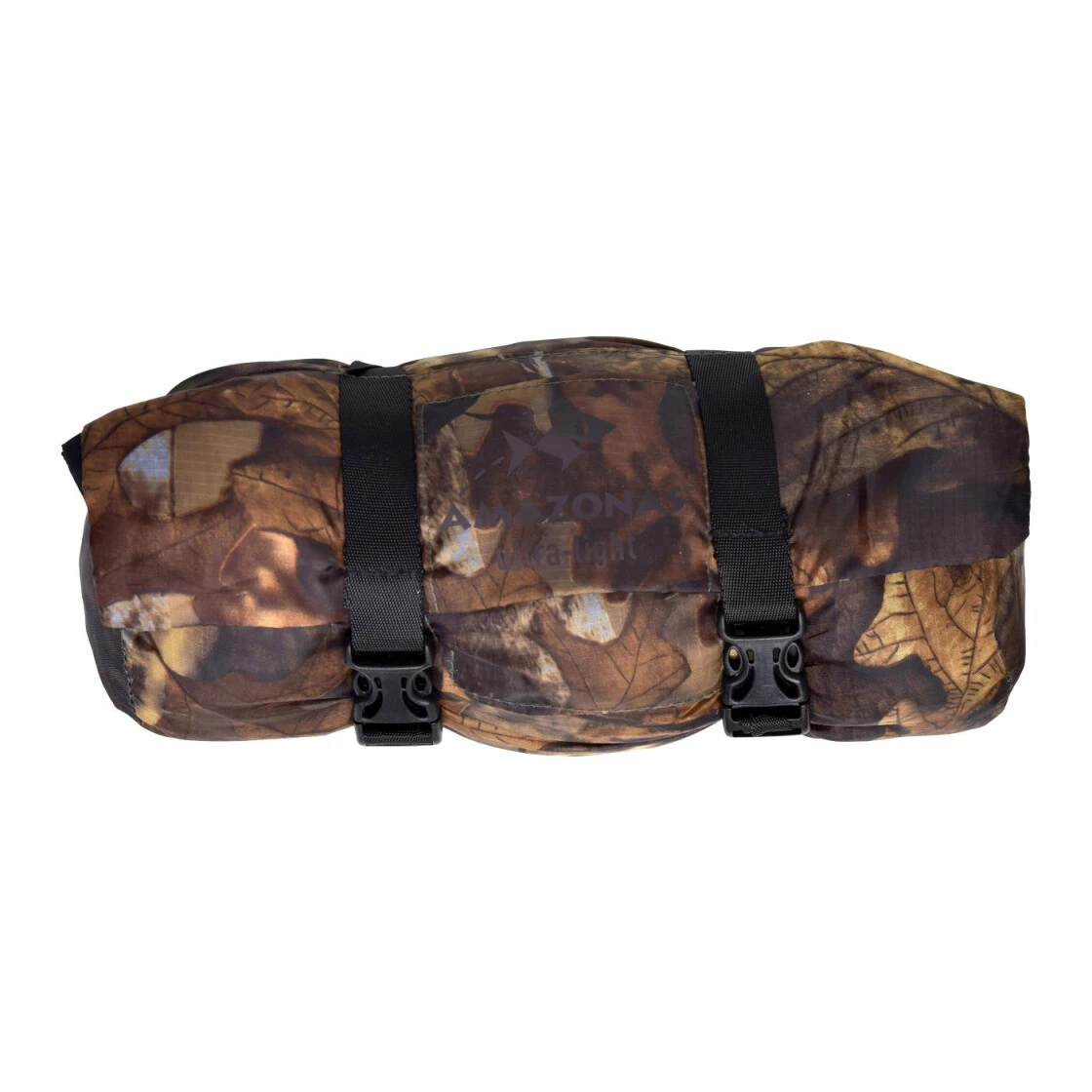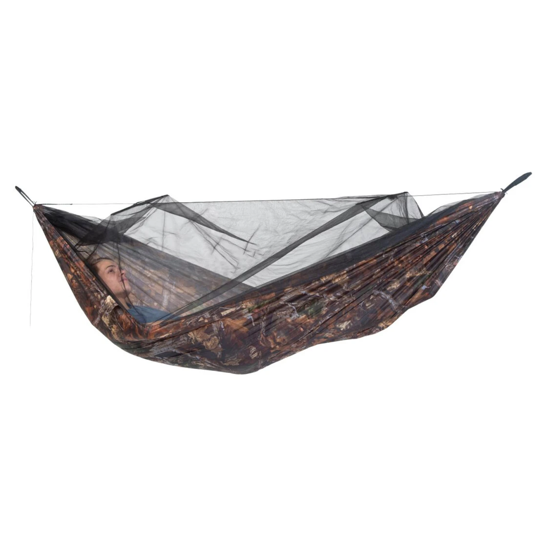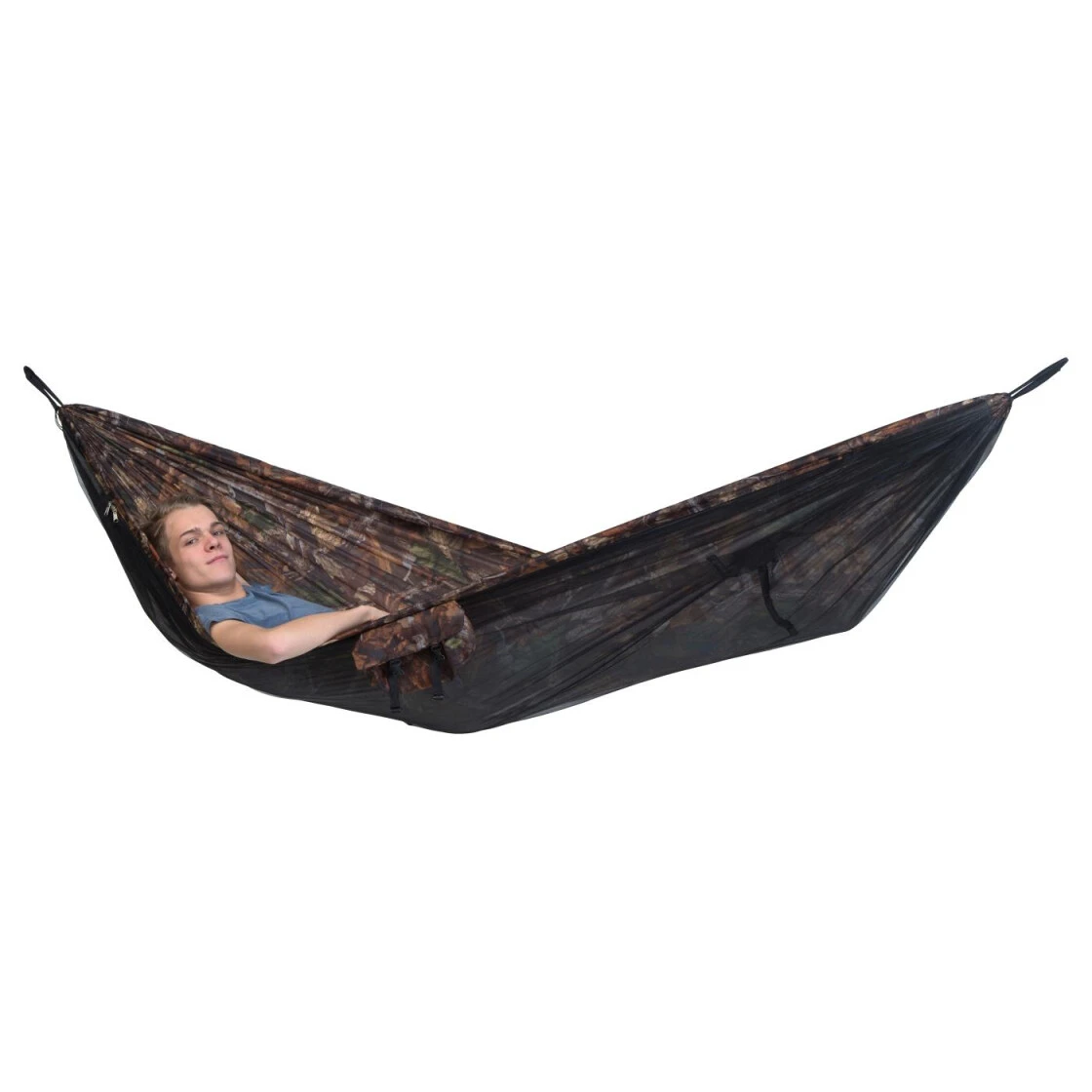 Die Ultraleicht-Hängematte Moskito-Traveller Forest kommt mit einem praktischen Moskitonetz, ist ultraleicht und hat ein sehr geringes Packmaß. Die Hängematte ist beidseitig benutzbar, mit oder ohne Netz. Dabei ist sie äußerst robust, bei einer Belastbarkeit von bis zu 200 kg. Ein besonders schneller Auf- und Abbau ist durch die fest installierte, längenverstellbare Moskitonetzaufhängung möglich. Es sind keine zusätzlichen Abspannpunkte für die Ridgeline notwendig. Der Einstieg erfolgt seitlich durch einen Doppelreißverschluss. Die patentierten, im Lieferumfang enthaltenen Spreizstäbe ermöglichen einen großen Innenraum. Für eine optimale Tarnung zu nahezu allen Jahreszeiten: Die Waldoptik kombiniert ein Muster aus Blättern, Bäumen und den typischen Farben des Waldes. Damit fügt sich die Hängematte unauffällig in den Hintergrund ein und optische Silhouetten verschwimmen.