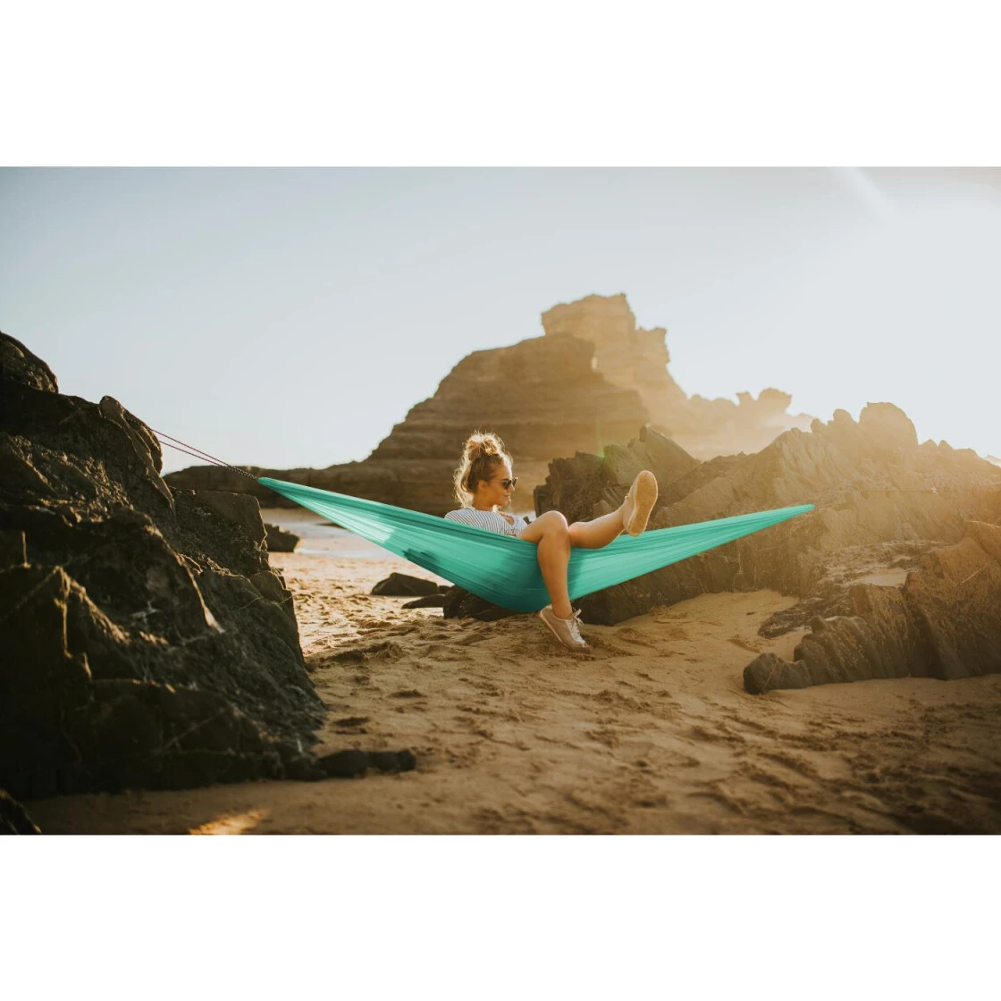 Die verstellbare All-in-One-Lösung! Die extragroße Leichthängematte mit integriertem Seil und Haken. Ganz einfach das Seil auf jeder Seite mehrfach um einen Baum wickeln und mit dem Haken befestigen. Fertig! Ideal für Reise und Ausflüge. Extra stabiles, atmungsaktives und hautfreundliches Material.