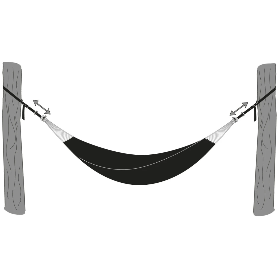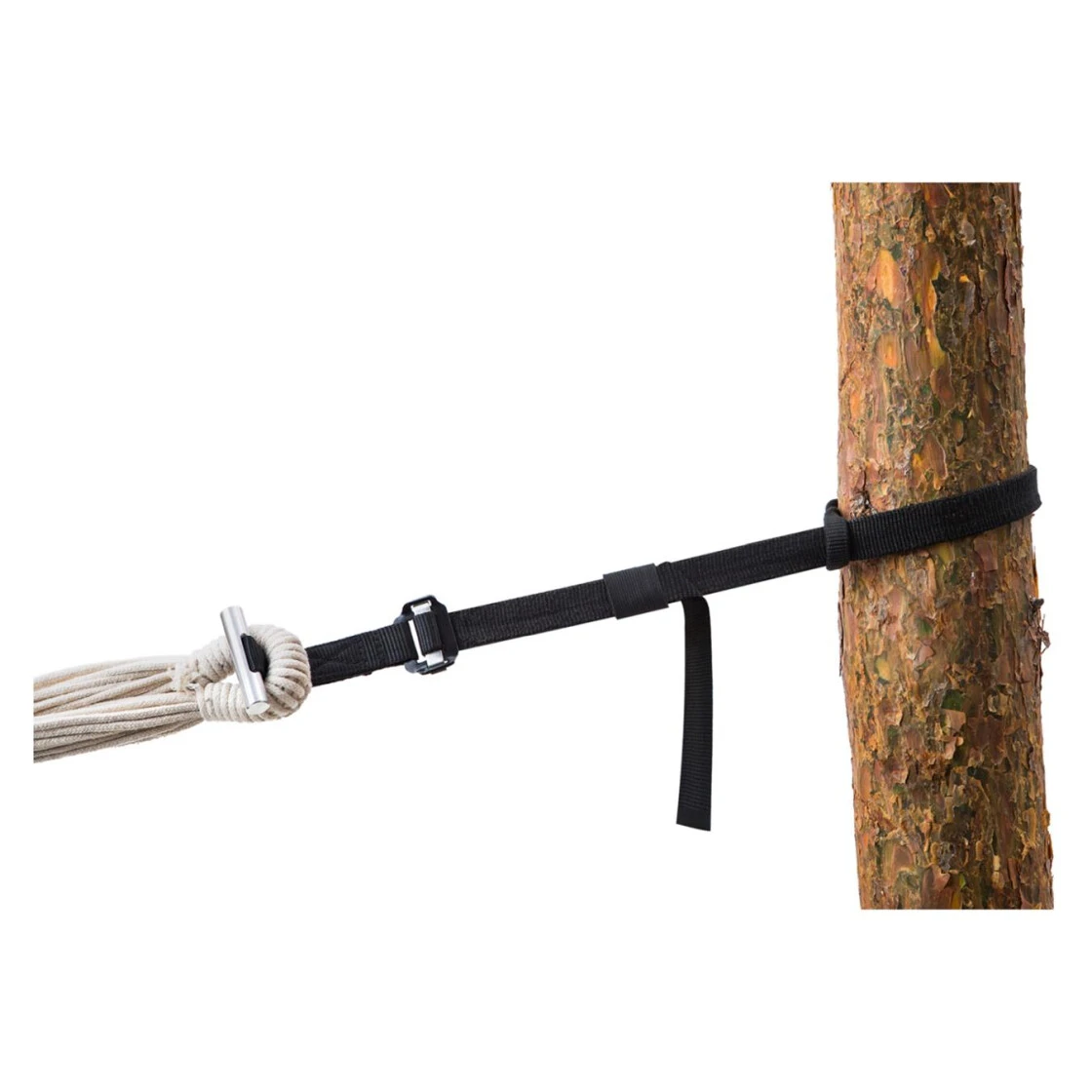 Set mit zwei speziellen Befestigungsgurten zum Aufhängen von Hängematten. Der Haltestift aus Aluminium dient als praktische Verbindung zur Hängemattenschlaufe. Einmal durchgesteckt stellt er sich quer und hält dann richtig fest. Das 25 mm breite Band schont die Bäume. Die Gurte sind jeder – Dank der Verstellschnalle – stufenlos von 15 bis 220 cm Länge verstellbar. Insgesamt ergibt sich so ein Verstellbereich von 30 bis 440 cm.