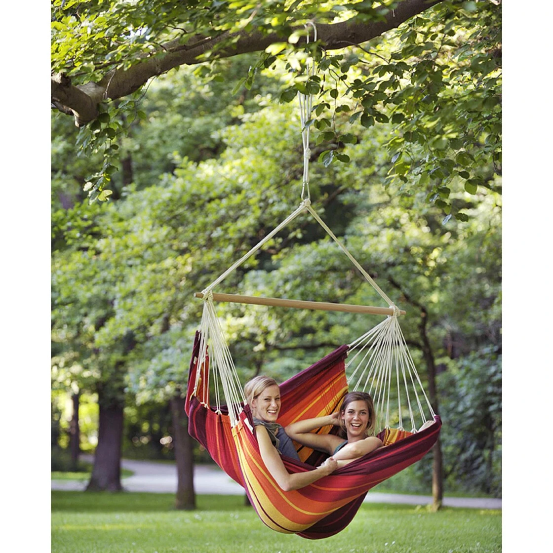 Der wahrscheinlich größte Hängesessel der Welt – bei den Ausmaßen eigentlich schon eher eine Hängematte. Mit dem gleichen festen Stoff wie bei der XXXL-Hängematte Gigante, aufgespreizt mit einem gigantischen 1,40 m Buchenholzstab.