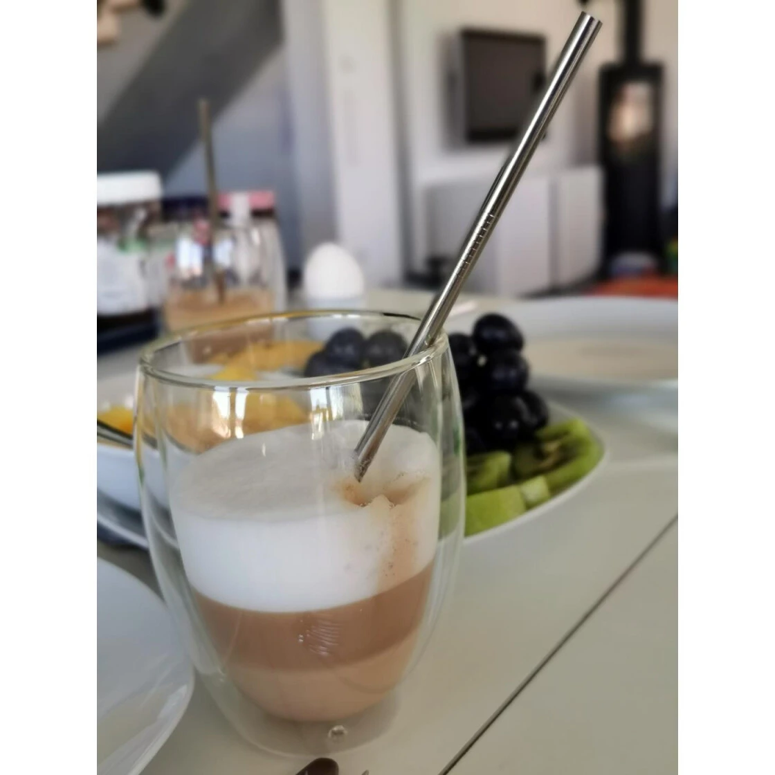 Die umweltfreundlichen Edelstahl-Strohhalme sind wiederverwendbar und verfügen über ein abgerundetes Mundstück für sicheres und komfortables trinken. Einfache Reinigung mit der beiliegenden Reinigungsbürste oder in der Spülmaschine.