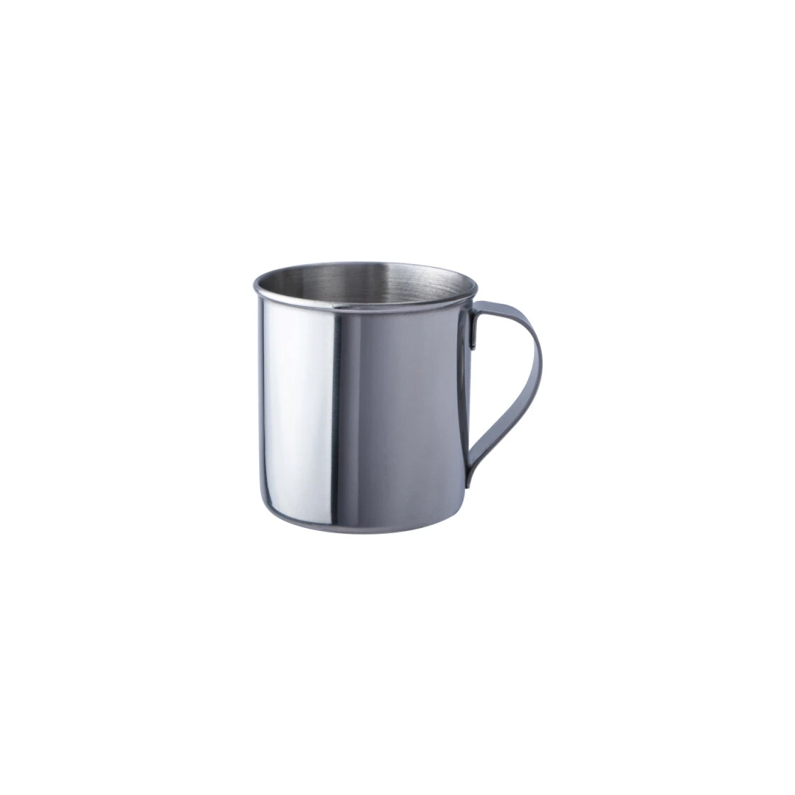 Einwandiger, polierter Edelstahlbecher in sehr guter Qualität und formschöner Ausführung. Mit stabilem Edelstahlgriff.