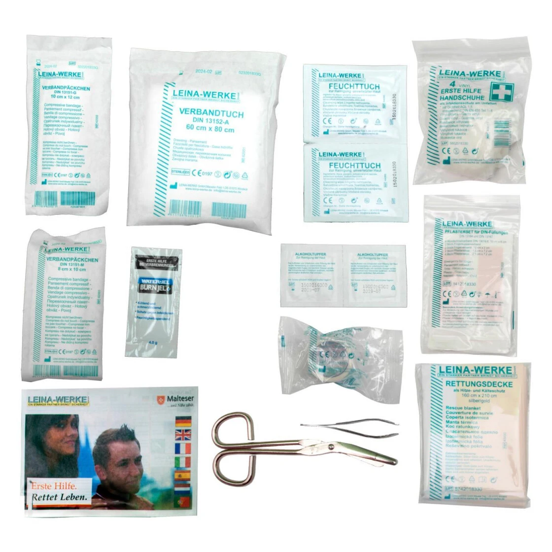 - 1 Verbandtuch A, 2 Dreiecktuch, 6 Kompressen 10 x 10 cm, 5 Mullbinden