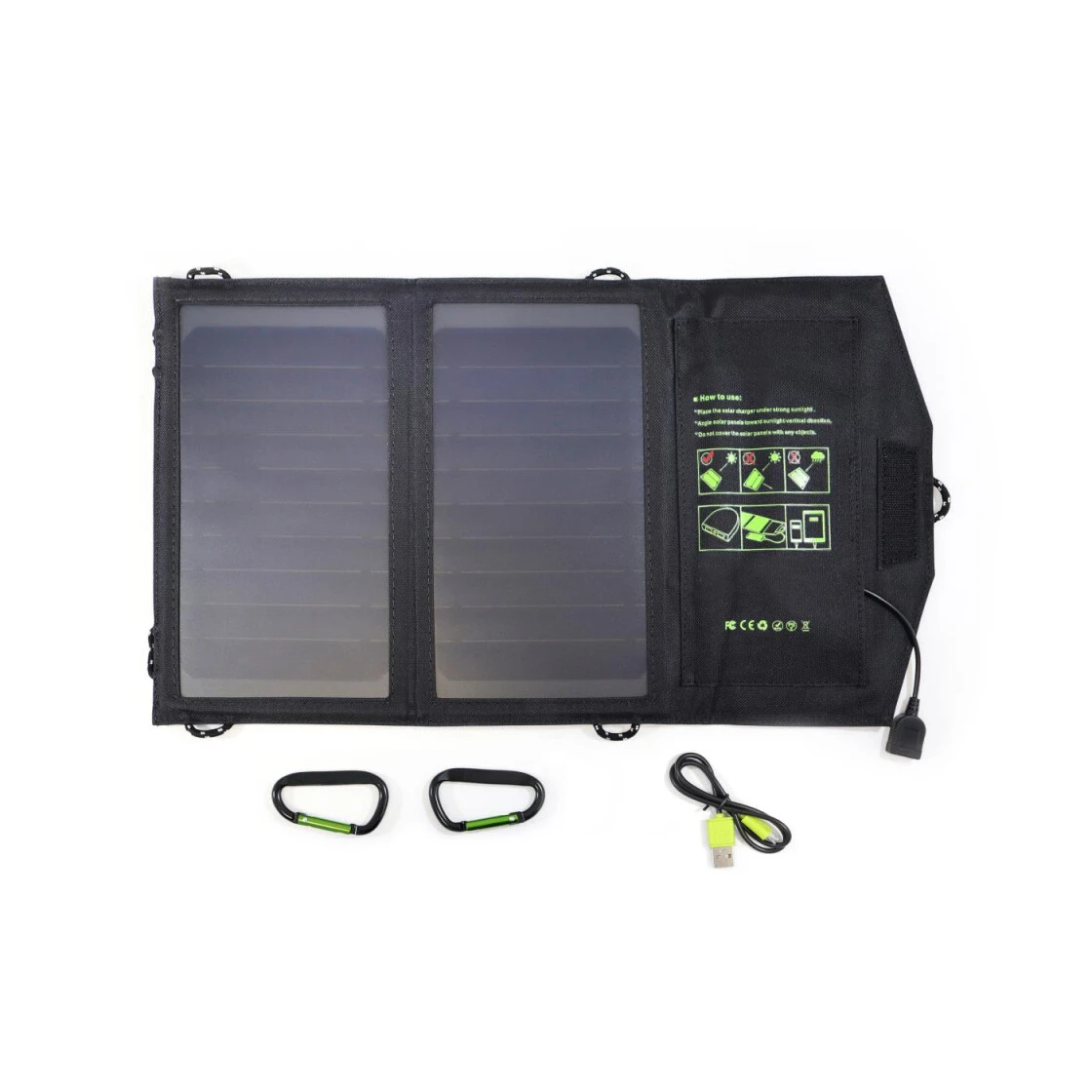- Lieferumfang: 1x Solarpanel, 2x Karabiner, 1x Micro USB Kabel, 1x Bedienungsanleitung