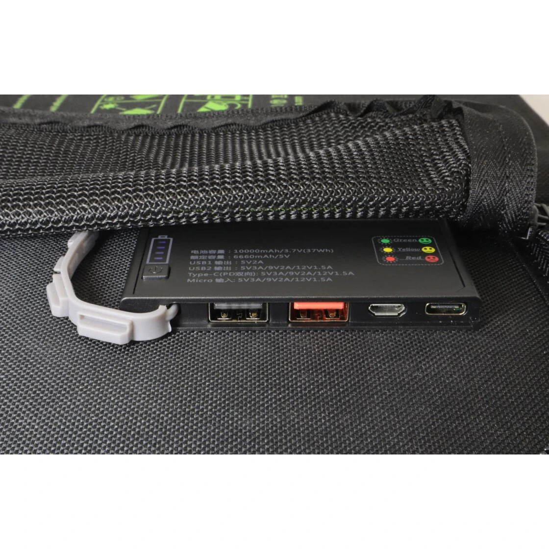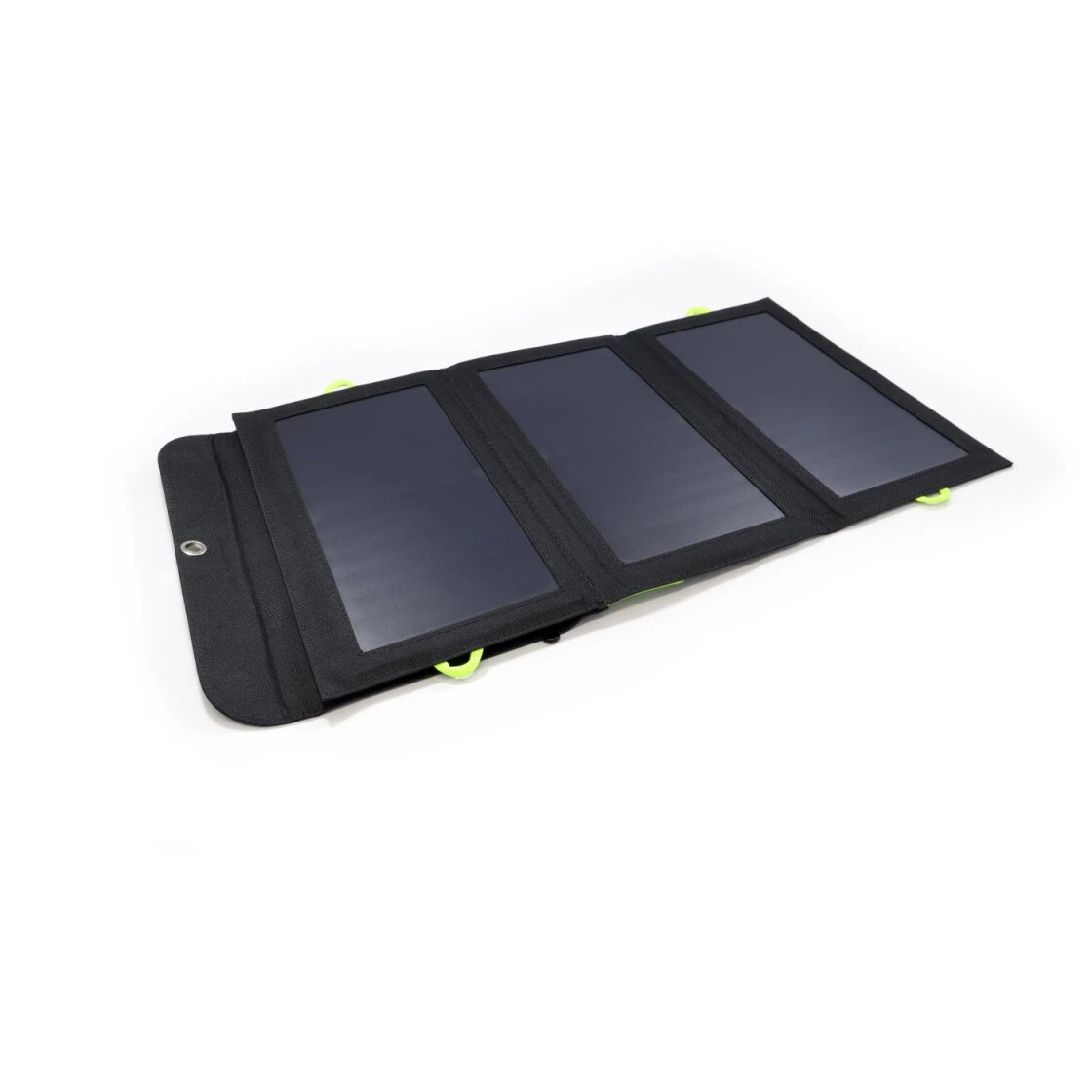 Das kompakte und mobile 3-fach Solar-Panel mit integrierter Powerbank (10.000 mAh) zur Aufladung für USB / USB-C Geräte-5V wie zum Beispiel Smartphones, Tablets und Powerbanks. Durch eine integrierte Powerbank können Geräte auch ohne Sonnenstrahlung geladen werden. Das Panel mit hochwertigen monokristalline Siliziumzellen, kann den Strom und die Spannung automatisch anpassen. Dabei erreicht es die maximale Leistung und liefert den schnellstmöglichen Strom bei gutem Sonnenlicht. Das kompakte Design macht die Handhabung und den Transport denkbar einfach. Aufklappen und das Panel möglichst senkrecht zur Sonne ausrichten. Ausgestattet mit Befestigungskarabiner und Befestigungsschlaufen zur Anbringung an z. B. Rucksack, Zelt oder sonstigen Haltepunkten. Das flache Design aus widerstandsfähigen Oxford Nylon Gewebe ist extrem robust, staub- und wasserabweisend. Die Innentasche ermöglicht zusätzlich flache und kleine Gegenstände zu verstauen.