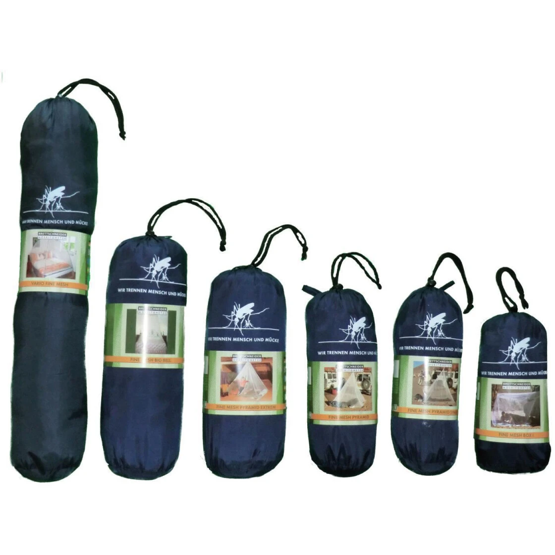 Baldachinförmiges Netz aus feinstem und besonders leichtem Polyamid. Liegt auf dem Bett auf. Sehr kleines Packmaß. Befestigung durch Schlaufen an der oberen Pyramidenspitze und an den unteren Ecken helfen diese beim Abdichten des Netzes um die Matratze.