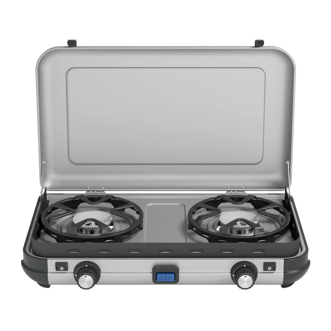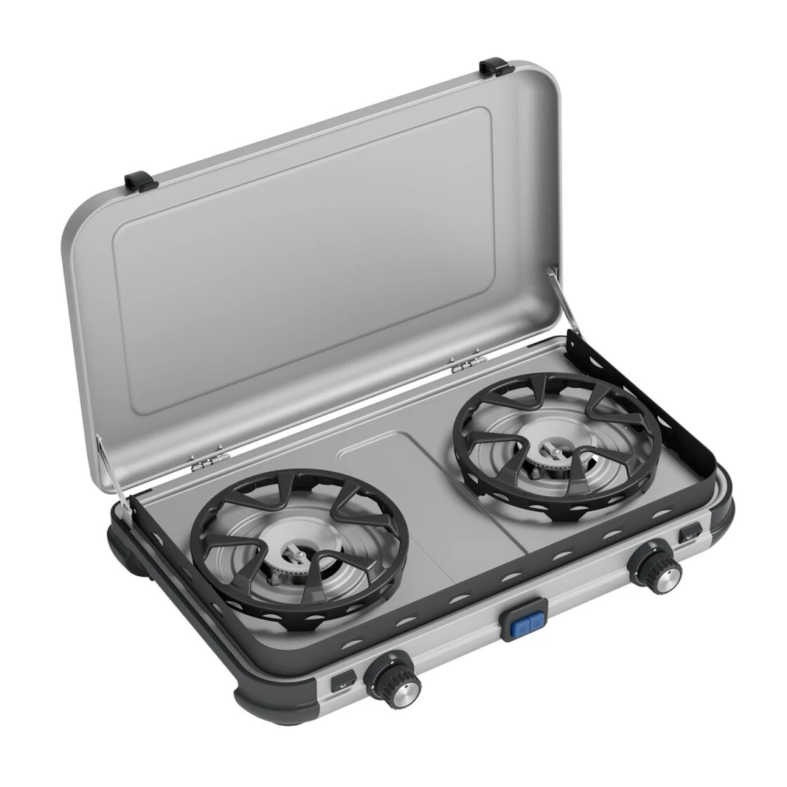 Die ‚Camping Kitchen 2‘ ist der perfekte Kocher für jeden Familienausflug, sei es für ein spontanes Wochenende oder für einen längeren Ausflug. Die Campingaz® ‚Camping Kitchen 2‘ ist ein leichter und einfach zu transportierender Kocher mit zwei Brennern, der je nach Länge des Urlaubs in 2 Versionen entweder für den Betrieb mit Kartusche oder aber für Gasflasche erhältlich ist. Das kompakte Design mit eingebauten Tragegriffen ermöglicht ein platzsparendes Verstauen im Auto oder dem Wohnmobil. Weiterhin hat der Kocher hitzeresistente Topfhalter aus emaillierten Stahl, die zusätzlich als Windschutz dienen. Die einfache Abnahme der Topfhalter ermöglicht ein schnelles und einfaches Säubern (auch in der Spülmaschine möglich). Modell Multi Cook nur für den Betrieb mit Gasflaschen erhältlich, incl. zusätzlicher Grillplatte.
