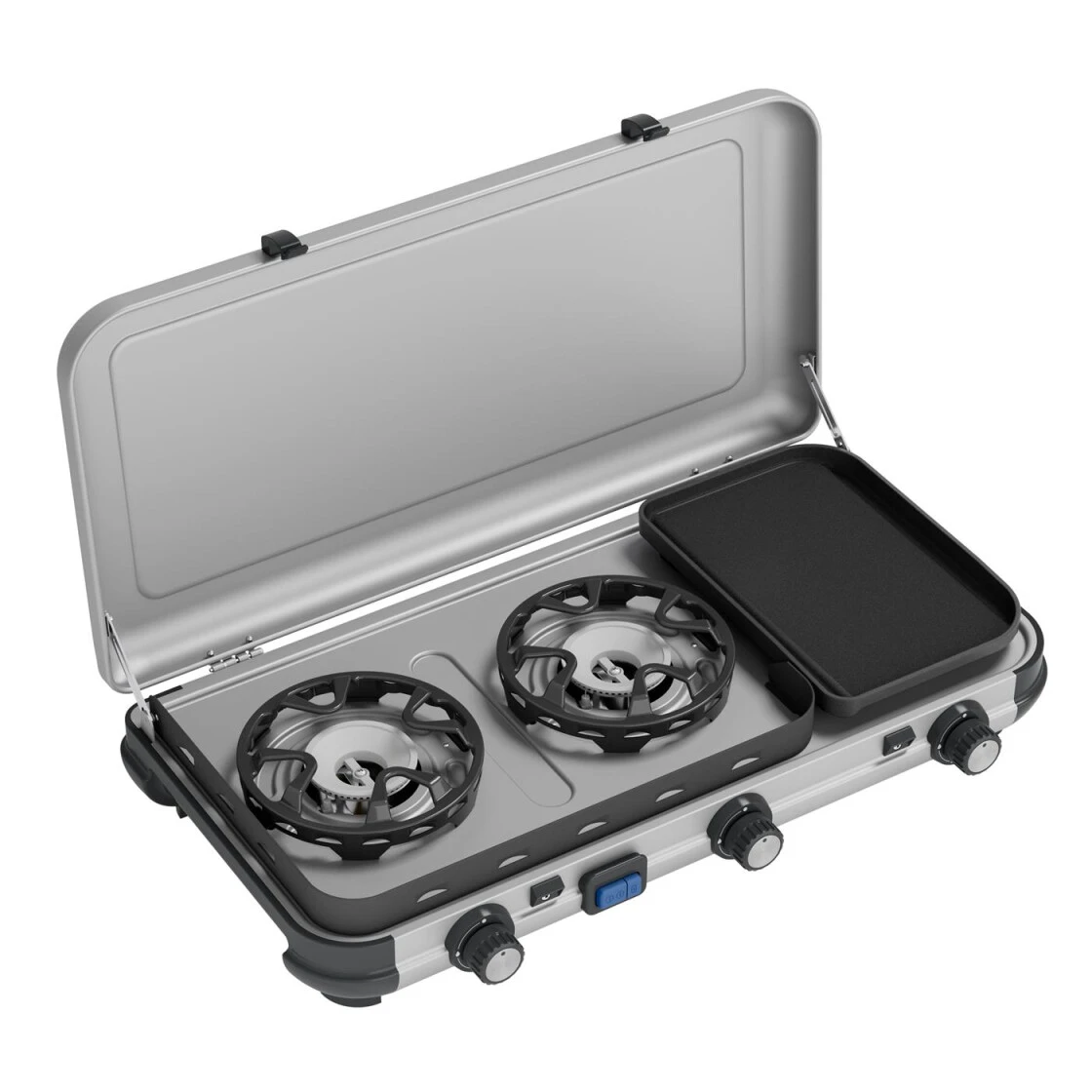 Die ‚Camping Kitchen 2‘ ist der perfekte Kocher für jeden Familienausflug, sei es für ein spontanes Wochenende oder für einen längeren Ausflug. Die Campingaz® ‚Camping Kitchen 2‘ ist ein leichter und einfach zu transportierender Kocher mit zwei Brennern, der je nach Länge des Urlaubs in 2 Versionen entweder für den Betrieb mit Kartusche oder aber für Gasflasche erhältlich ist. Das kompakte Design mit eingebauten Tragegriffen ermöglicht ein platzsparendes Verstauen im Auto oder dem Wohnmobil. Weiterhin hat der Kocher hitzeresistente Topfhalter aus emaillierten Stahl, die zusätzlich als Windschutz dienen. Die einfache Abnahme der Topfhalter ermöglicht ein schnelles und einfaches Säubern (auch in der Spülmaschine möglich). Modell Multi Cook nur für den Betrieb mit Gasflaschen erhältlich, incl. zusätzlicher Grillplatte.