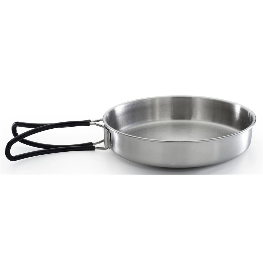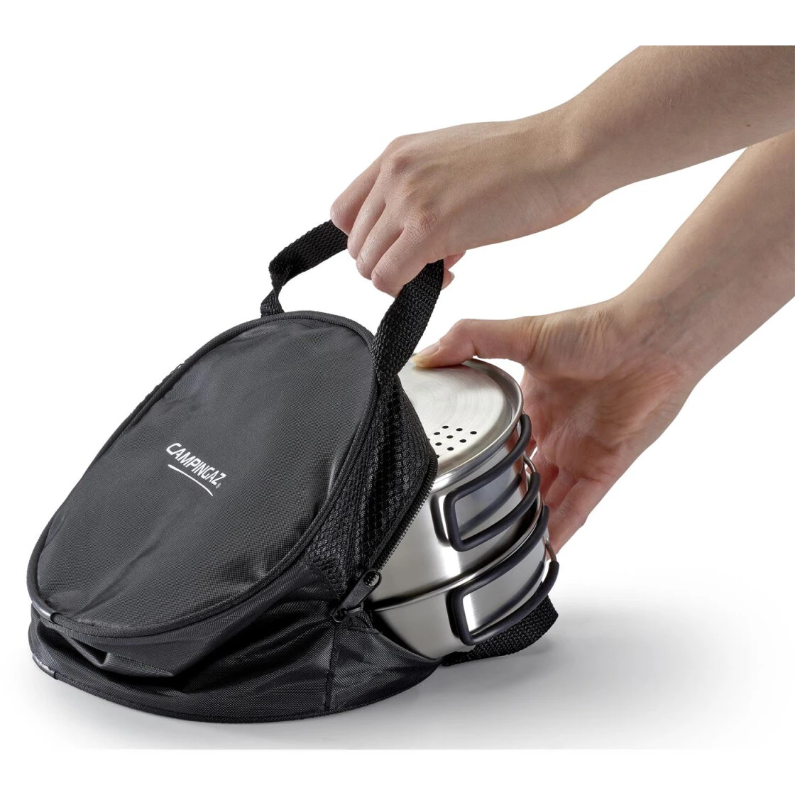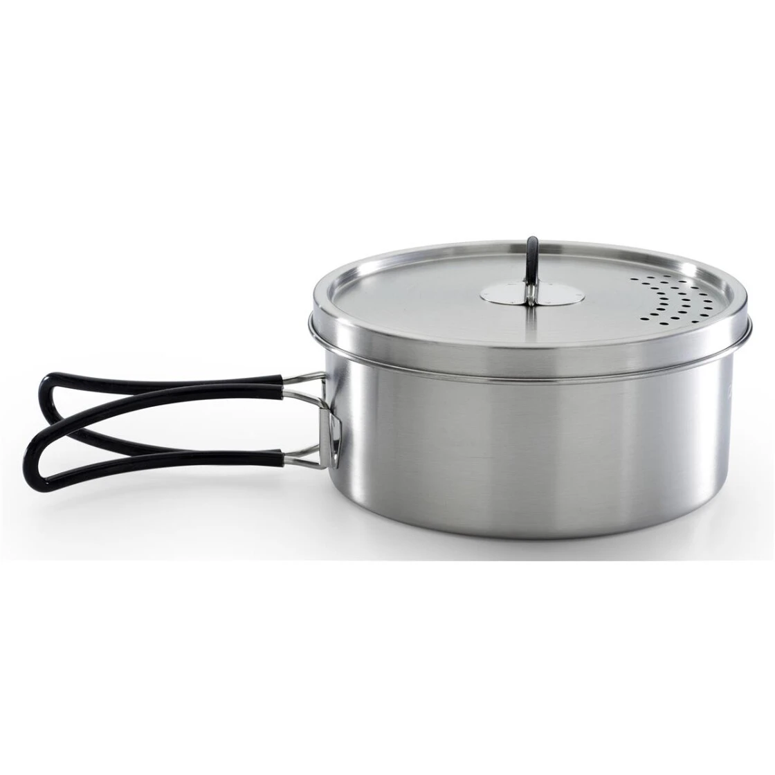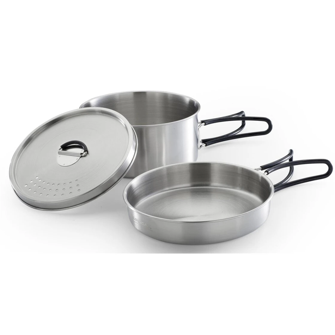 Edelstahl Kochset bestehend aus Topf mit Deckel und Pfanne. Der Deckel hat ein integriertes Abtropfsieb. Praktisch z. B. beim Nudeln kochen. Das Set ist mit anklappbaren Silikongriffen ausgestattet.