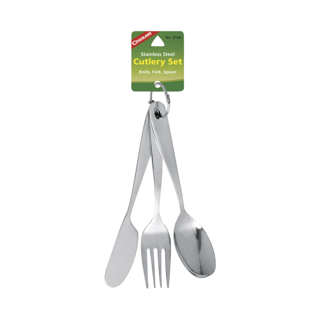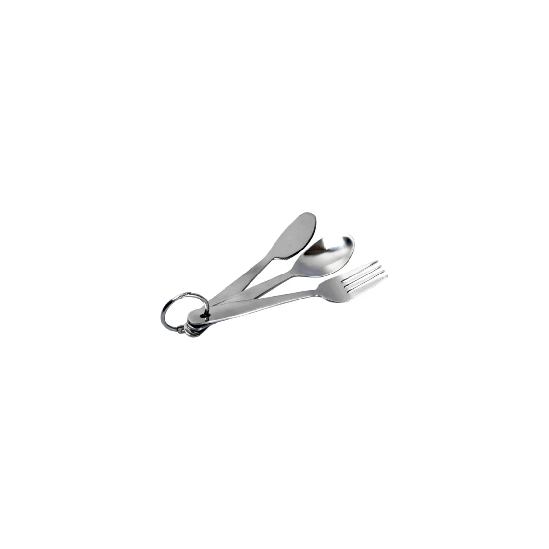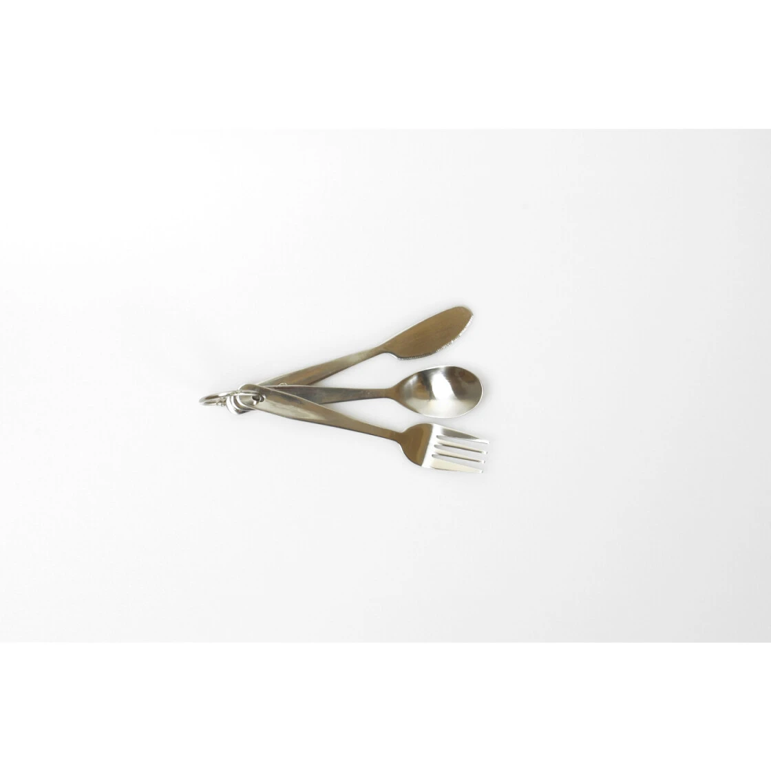 Kleiner, kompakter Bestecksatz aus Edelstahl am Ring (zum Transport). Auch ideal als Kinderbesteckset.