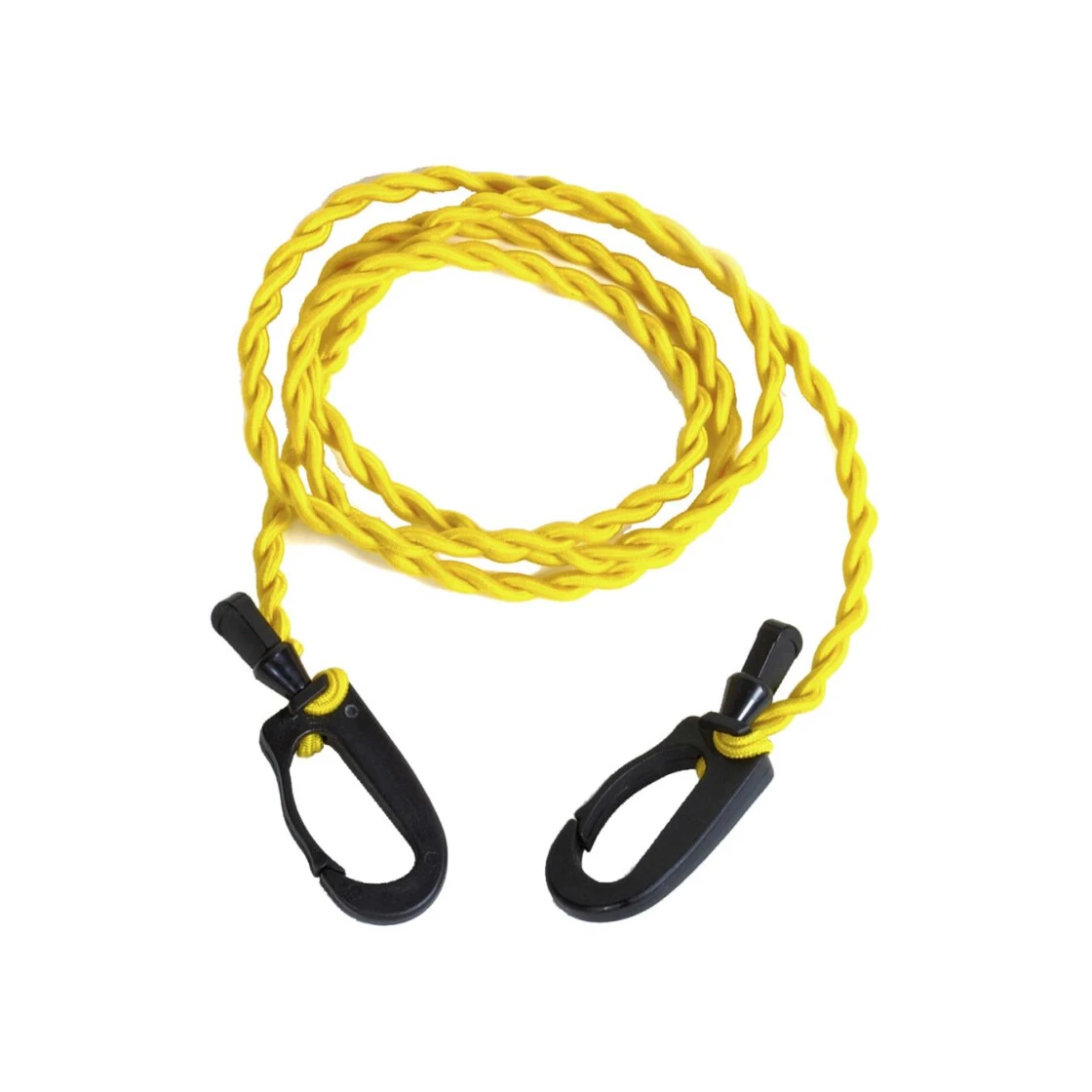 Stabile Wäscheleine aus zusammengedrehten Gummiseilen und groß dimensionierten Kunststoffkarabinern. Spannen Sie die Wäscheleine zwischen Bäumen oder Stangen, im Hotelzimmer oder Caravan und klemmen Sie zwischen die Gummiseile die Wäsche und/oder alles, was aufgehängt werden soll (z. B. auch Taschenlampen, Leuchtstäbe, etc.). Länge von Karabiner zu Karabiner ungedehnt 160 cm, gedehnt bis zu ca. 350 cm. Ca. 100 g, gelbes Seil.