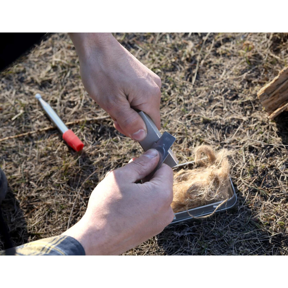 - enthält Zündstahl, Schaber, Magnesiumblock, Blasrohr und Jute