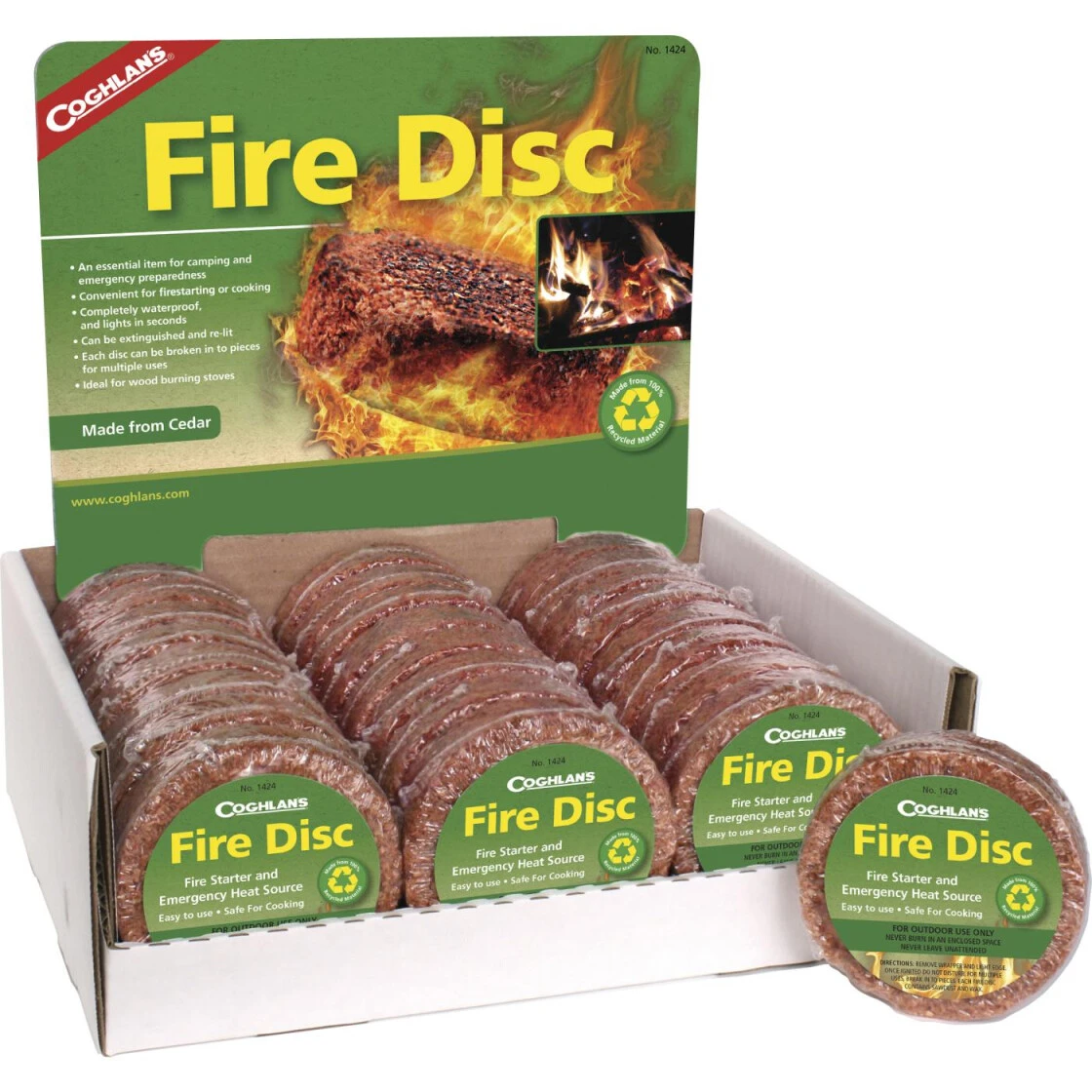 Die Coghlans ‚Fire Discs‘ sind die ideale Lösung zum Entfachen von Lagerfeuern oder Holzöfen. Aus Zedernholz und raffiniertem Wachs hergestellt, entzünden sich die Disks leicht und brennen mit großer Hitze und auch ausreichend lang um effektiv das Holz zu entzünden. Da sie eine Brenndauer von bis zu 30 Minuten erreichen, können Sie auch mal – mit dem richtigen Gestell (z. B. Vargo Kocher) – als Notkocher oder als Wärmequelle fungieren. Unbegrenzt lagerfähig.