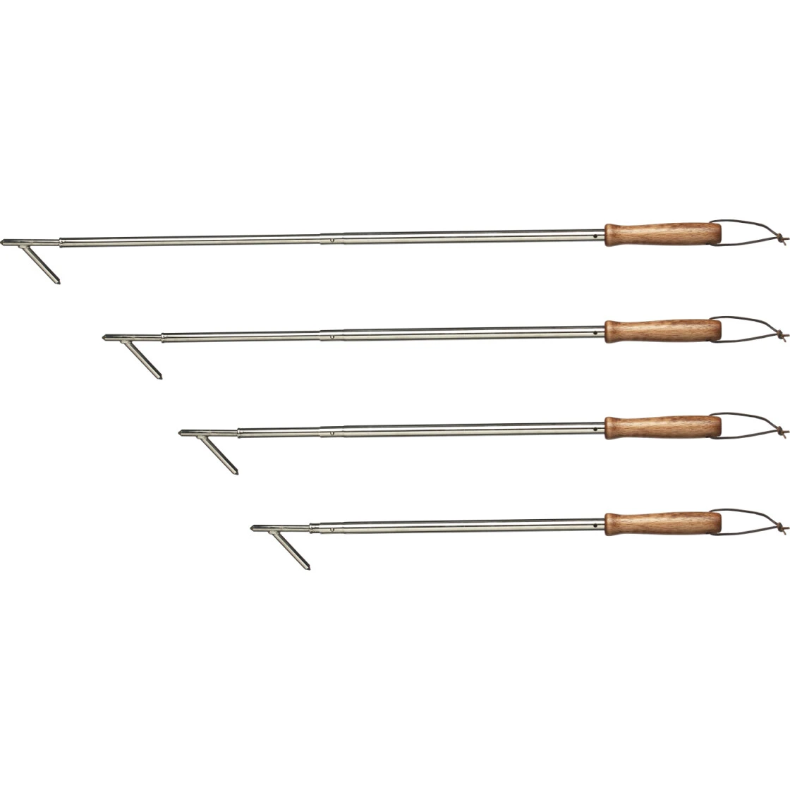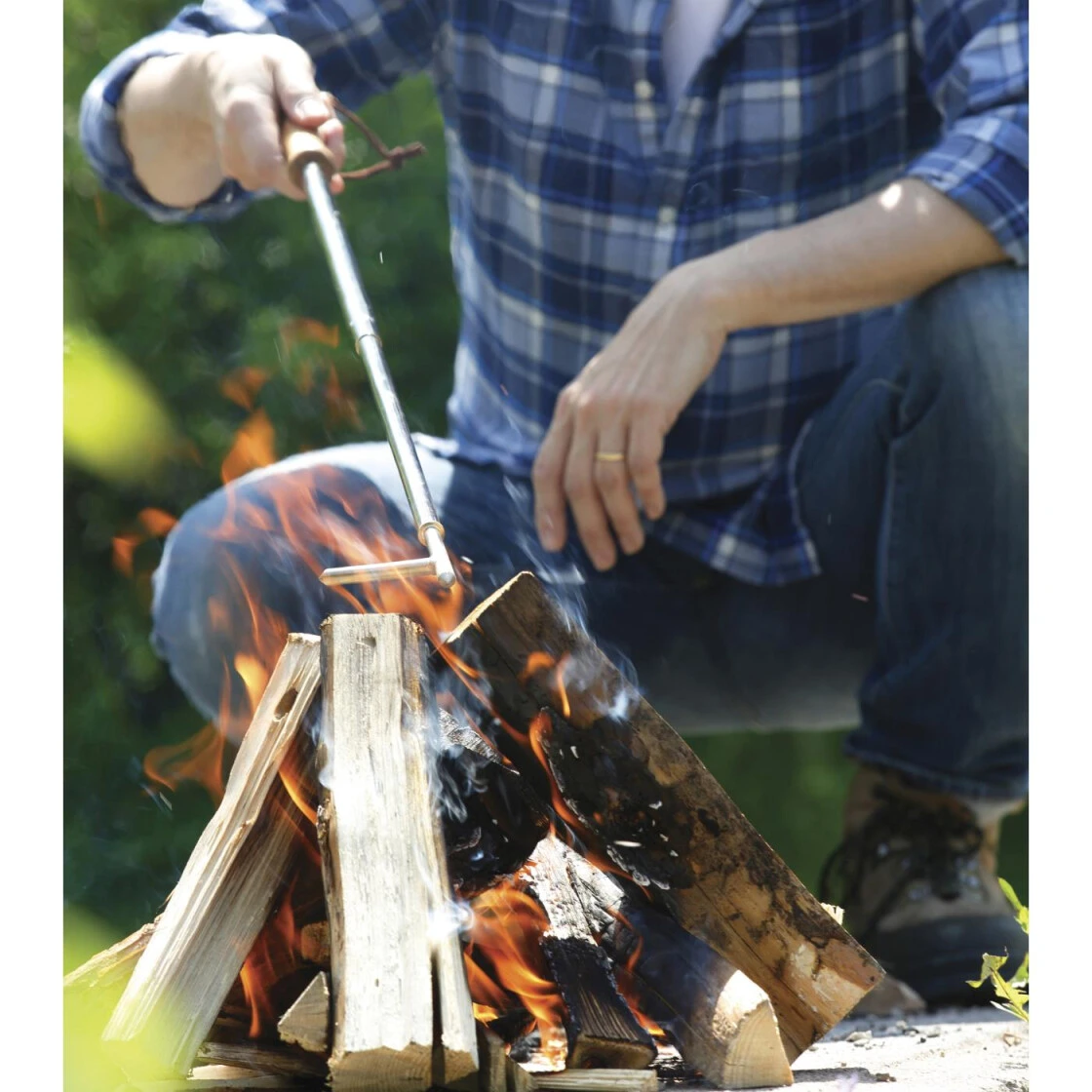 Stabiler, verchromter und teleskopierbarer Feuerhaken. Der Holzgriff bleibt kühl und ist angenehm zu greifen. Mit dem Haken kontrollieren Sie aus der Distanz und ganz bequem die Glut oder das Feuer – ob beim Camping oder an der heimischen Feuerstelle.