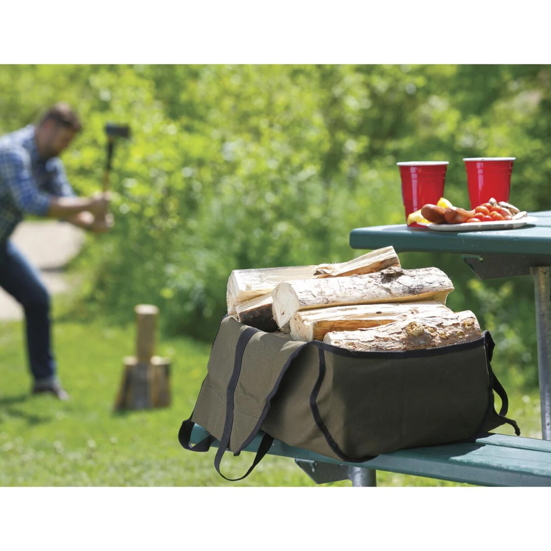 Eine große Segeltuchtasche um Ihr Brennholz und andere Ausrüstung zum Camp zu transportieren. Perfekt für Camp, Haus und Garten. Mit stabilen Griffen, welche mit Klettverschluss für den einfachen Transport befestigt werden können. Die geschlossenen Enden der Tasche bewahren auch einzelne Teile vor dem Herausfallen. Hergestellt aus strapazierfähigem Baumwoll-Canvas und verstärkt mit Polyester-Riemen.