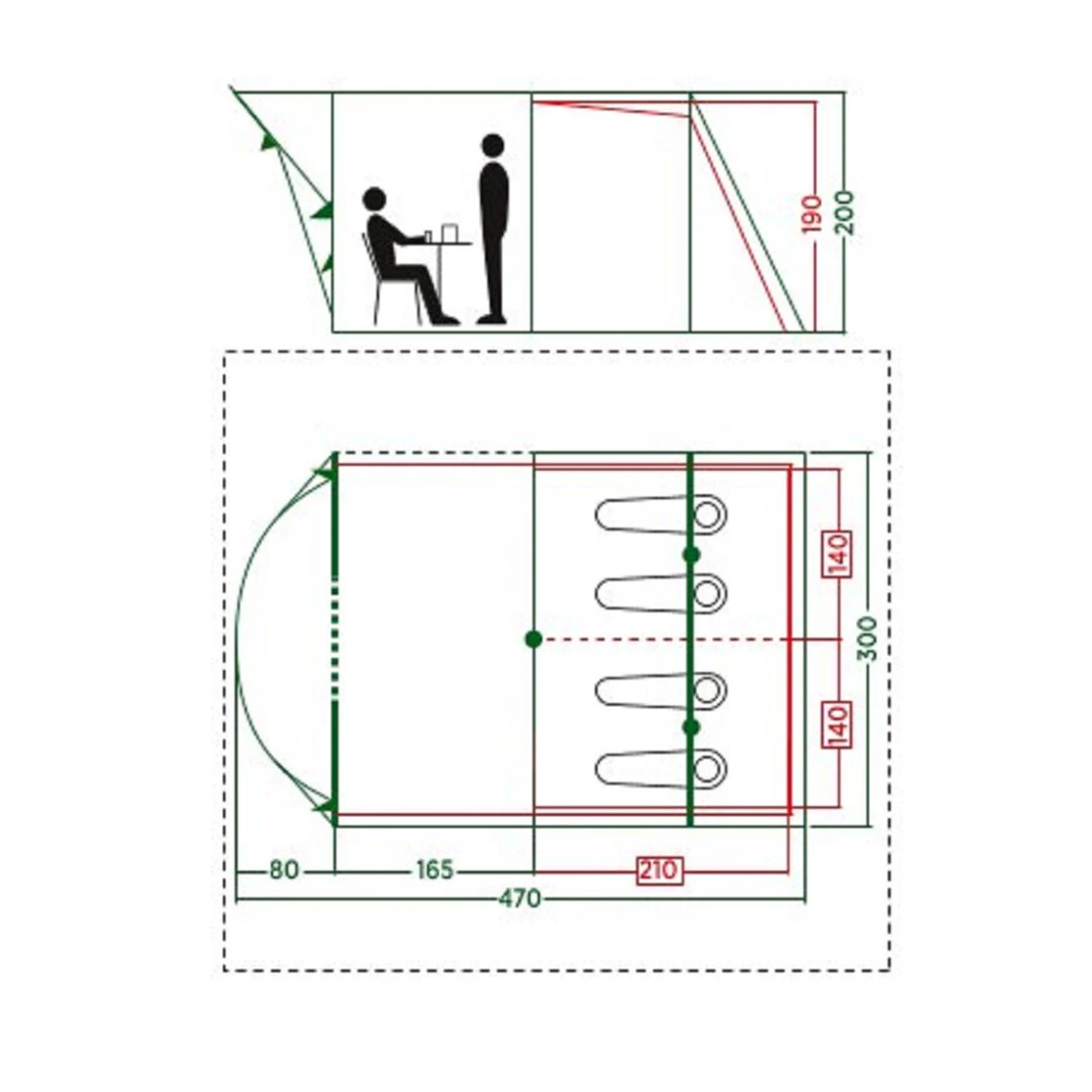 Ein Familienzelt mit Tunnelstruktur. Ausgestattet mit 2 Türen, Blackout Bedroom Technologie, Sturmabspannseile, Öffnung für Kabel, Reißverschlussstopper, abgeklebte Nähte, obere und untere Ventilation und vieles mehr.