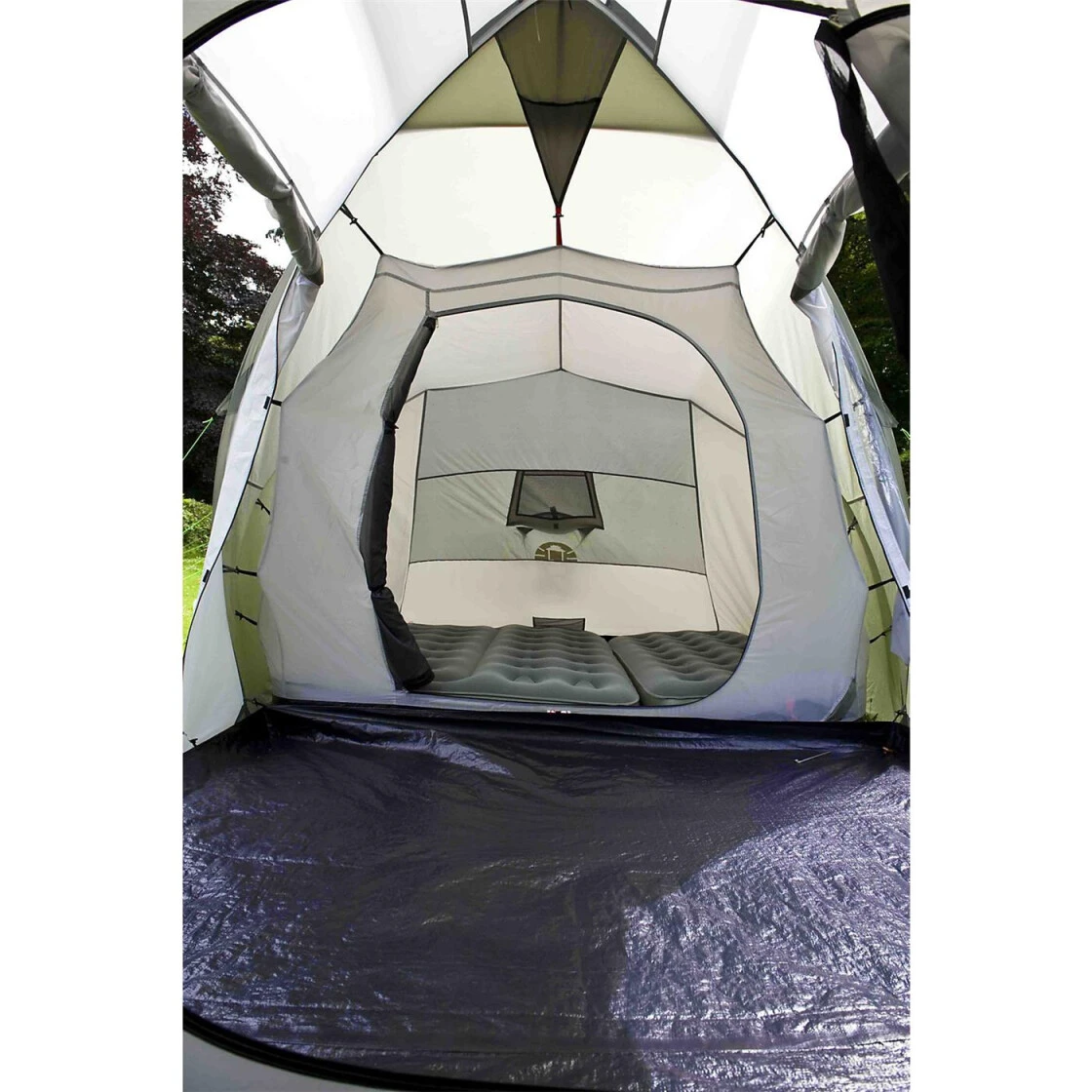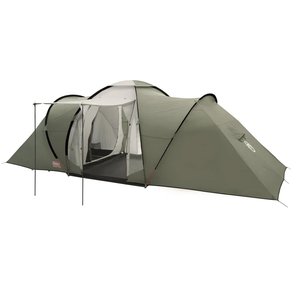 Großes komfortables Kuppelzelt mit 2 separaten Schlafkabinen und dazwischenliegendem Wohnbereich. Das Zelt hat 2 Eingänge, 2 Ventilationsklappen, 2 Innentaschen sowie einen Kabelschlitz.