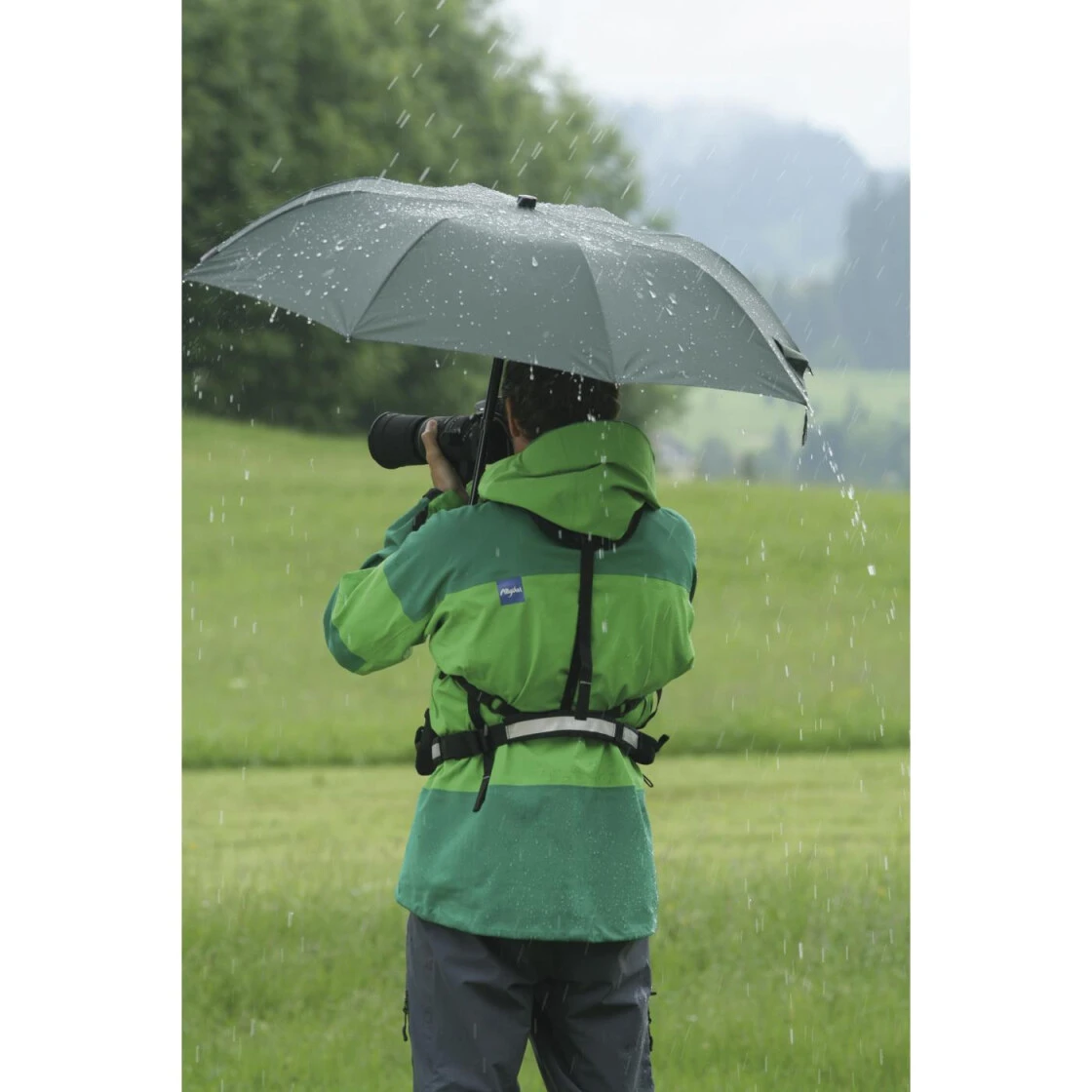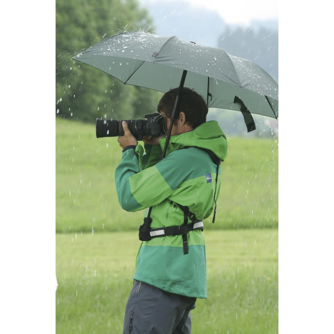Modell der Sonderklasse: handfreier und teleskopierbarer Trekkingschirm. Der Schirm ist unkompliziert vorne am Rucksacktragesystem zu befestigen (Hüftgurt ist Voraussetzung!) und sowohl gerade, als auch geneigt (zur Windseite) zu tragen. Beide Hände bleiben frei, um z. B. mit Stöcken zu gehen, Karten zu lesen, den Hund zu dirigieren oder die Kinder zu führen. Der Schirmgriff kann mittels 2-facher Teleskopverstellung passend in der Länge eingestellt werden. Mit leichtem Fiberglasgestell und hauchdünner Bespannung aus 100 % Polyestergewebe mit Teflon®-Behandlung (eingetragene Marke von DuPont, die unter Lizenz von Eberhard Göbel GmbH & Co. genutzt wird), für den höchsten Abperleffekt. Natürlich ist der Schirm auch als ’normaler‘ Trekkingschirm zu nutzen. Komplett mit Befestigungsklipps und Trageköcher. In oliv optimal für Naturfreunde, Jäger, Fischer usw.
