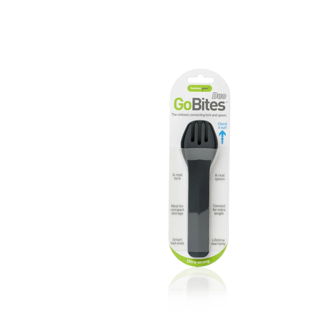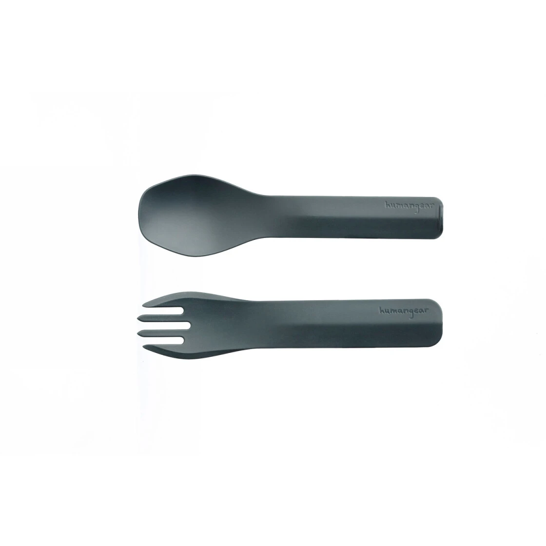 Bei dieser neuartigen Gabel-Löffel-Kombination können beide Teile bequem getrennt benutzt werden. Gegenläufig zusammengesteckt sind sie lang genug, um auch in den hohen Tüten der Travel-Fertiggerichte gut zu funktionieren oder mal aus dem Topf essen zu können. Zum Transport können sie zusammengesteckt und dann sehr klein und klapperfrei mit auf jede Reise gehen. Der Löffel hat sehr weiche und mundgerechte Kanten, die Gabel verfügt über genügend ‚Spitze‘ für ein vernünftiges Mahl. Auf eine Messerfunktion wurde auch hier im Sinne der Kompaktheit verzichtet. Ein schön gestaltetes Esswerkzeug.