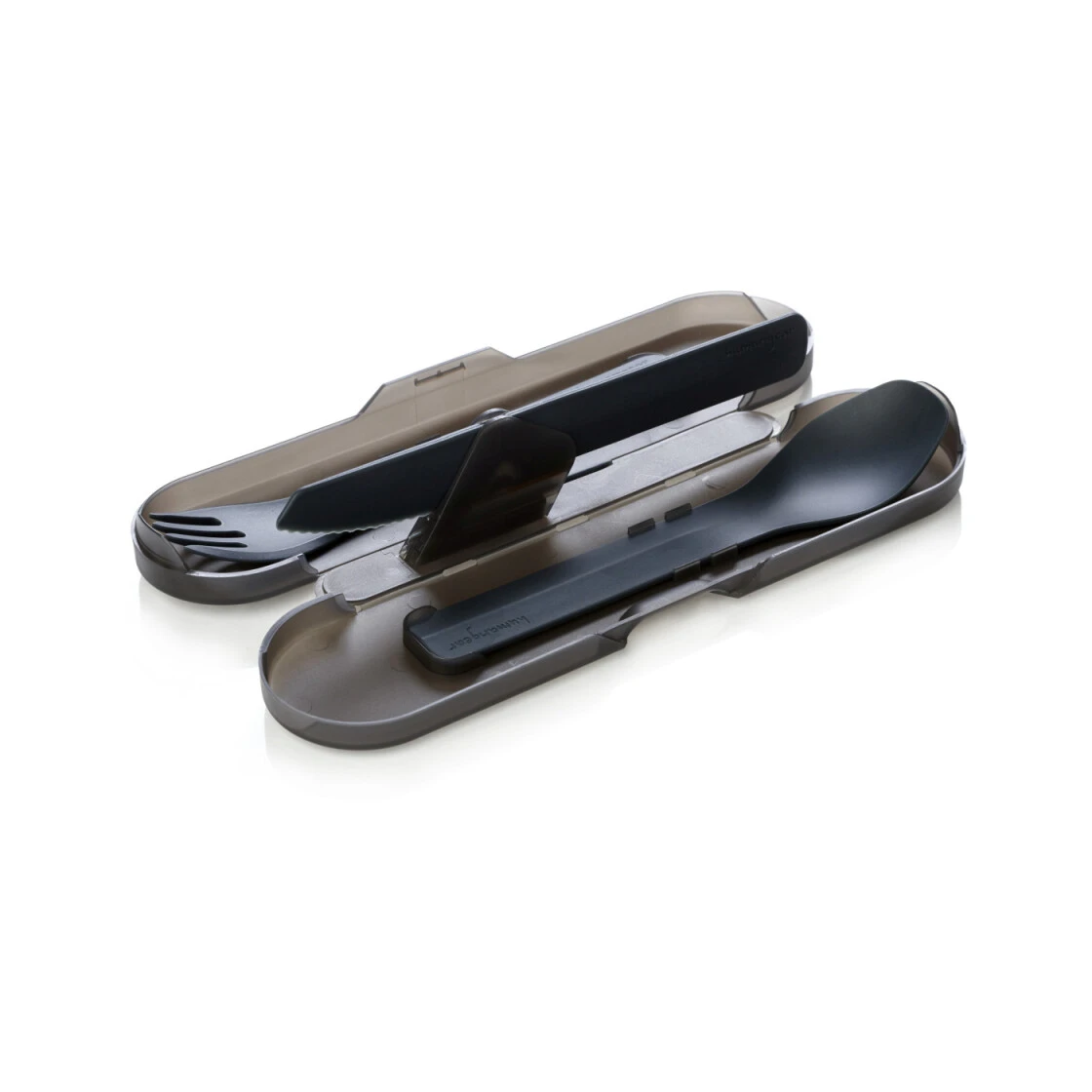 Reisebesteck in neuer Form und Art: die kompakte Transportdose bietet geöffnet Zugriff auf jedes einzelne der Teile und schützt das Set hygienisch. Beinhaltet sind im Trio je eine Gabel mit vernünftigen Spitzen und einer Teil-Kante (für weichere Lebensmittel), ein Löffel mit sehr weichen und mundgerechten Kanten sowie ein Messer mit gewellter Klinge. Dadurch wird eine gute Schneidleistung erreicht, die auch für zarteres Fleisch vollkommen ausreichend ist. Integriert im Messer ist ein Kapselheber. Als Zugabe ist im Set auch ein Zahnstocher zu finden. Leicht zu reinigen und leicht zu tragen.