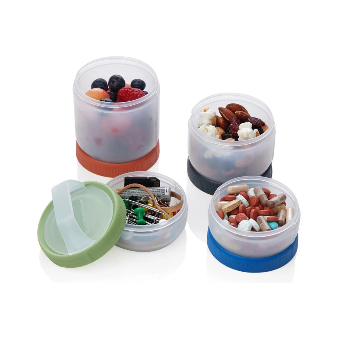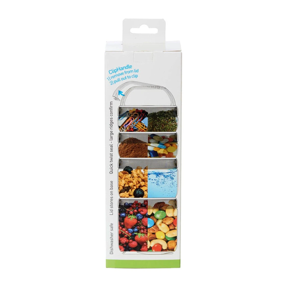 Modulares auslaufsicheres Aufbewahrungssystem mit einfachem Öffnen und Schließen durch 180-Grad-Drehung. Die Behälter sind spülmaschinenfest, mikrowellengeeignet und leicht zu reinigen. Ausgestattet mit einem Clipgriff, der zum Beispiel an einem Rucksack befestigt werden kann.