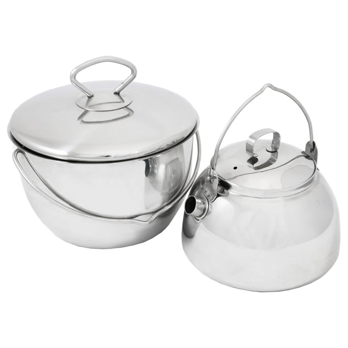 Ein leichtes und kompaktes Kochset für das Lagerfeuer. Das Set passt auch bei kleinstem Raum – die Kaffeekanne kommt zum Transport in den Topf und eine praktische Schutztasche für das Set ist im Lieferumfang enthalten. Die Tasche schützt auch die anderen Campingartikel vor Ruß. Pfanne und Topf sind aus hochwertigem Edelstahl gefertigt und haben jeweils einen Aufhängegriff.