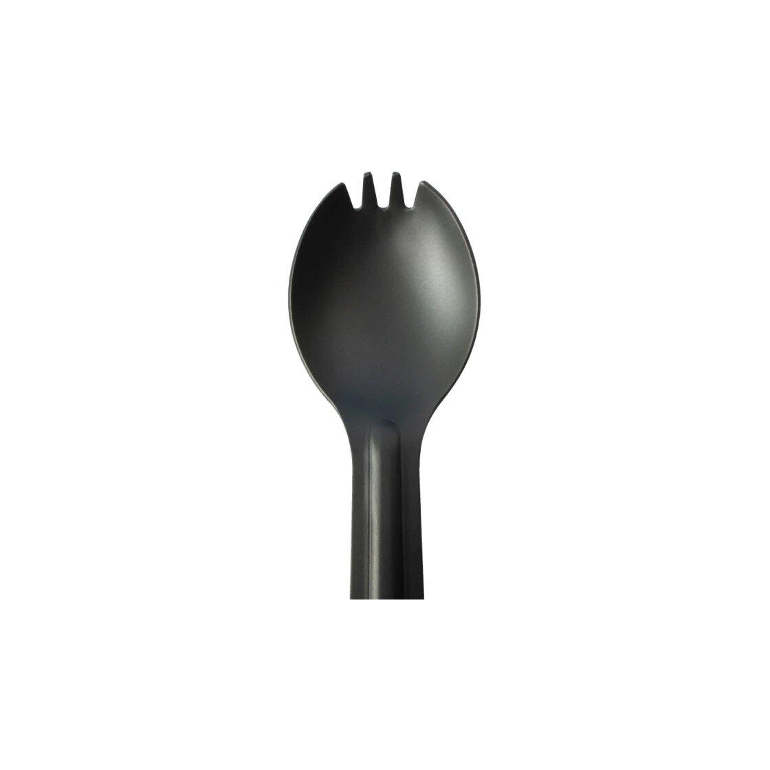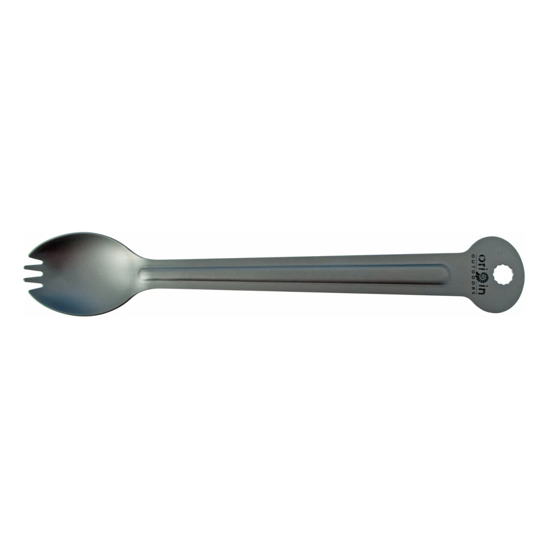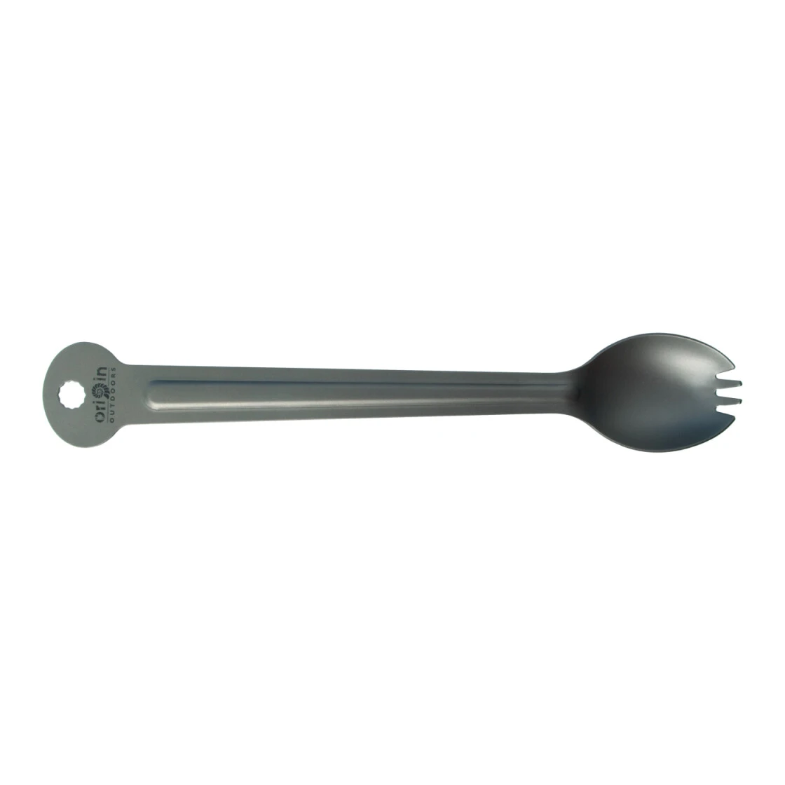 Extra langes und leichtes Universalbesteck mit Gabel, Löffel und praktischer Befestigungsöse. Der Spork aus rostfreiem Titan, besticht durch seine abgerundeten Kanten und ergonomische Form. Bestens geeignet für hohe Thermobehälter oder Reisenahrung aus der Tüte. Dank der Multifunktionalität sparen Sie zusätzliches Gewicht. Der Spork ist der perfekte Begleiter zum Reisen, Wandern und Trekking. Leicht zu reinigen und spülmaschinenfest.