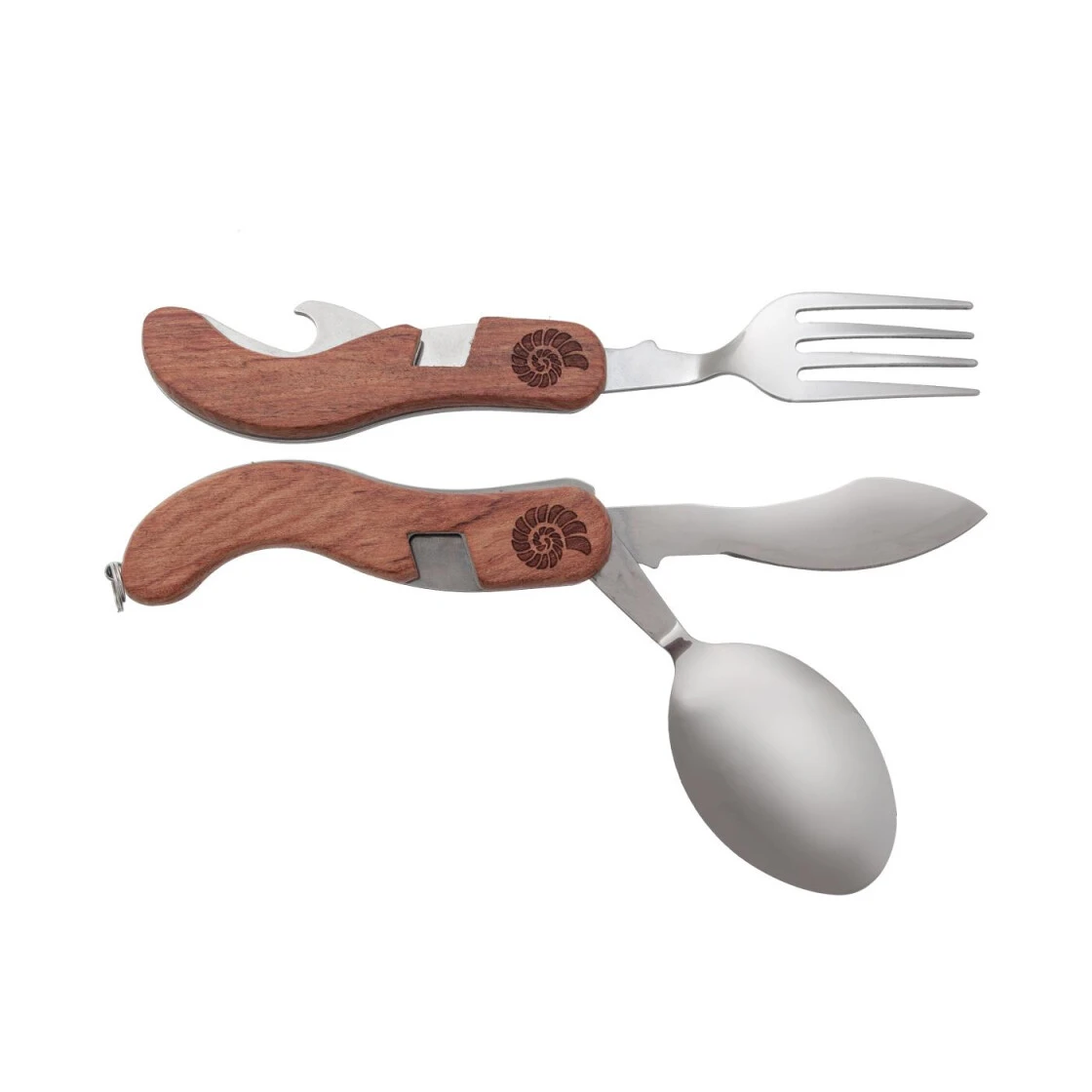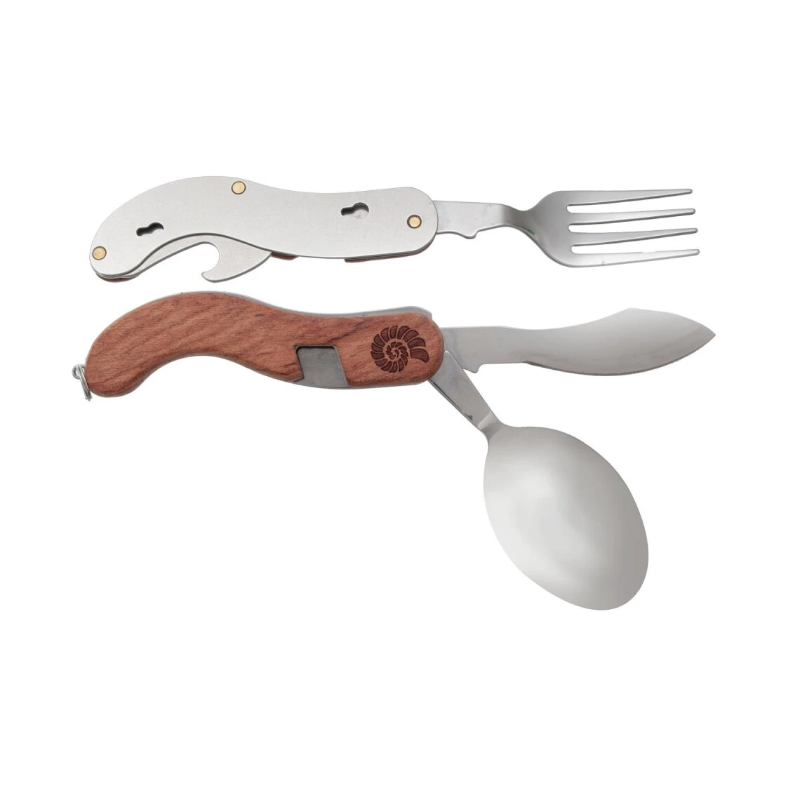 Eine edle Palisanderholzapplikation fasst das aus hochwertigem Edelstahl gefertigte Besteckset ein. Das Design ist im Taschenmesserformat gehalten, dass Set passt somit in jede Hosentasche. Es ist so konzipiert, dass es in zwei Teile zerlegbar ist. Das vielseitige Besteckset bestehend aus Messer, Gabel und Löffel samt Flaschenöffner und Schlüsselanhänger. Die Gabel kann vom Messer und Löffel getrennt und einzeln verwendet werden. Zusammengesteckt wiederum ist es ein kompaktes Set und lässt sich leicht im Gepäck verstauen. Arretiert werden die beiden Teile durch die Gabel welche zuerst aufgeklappt werden muss, um die beiden Teile durch verschieben voneinander trennen zu können.