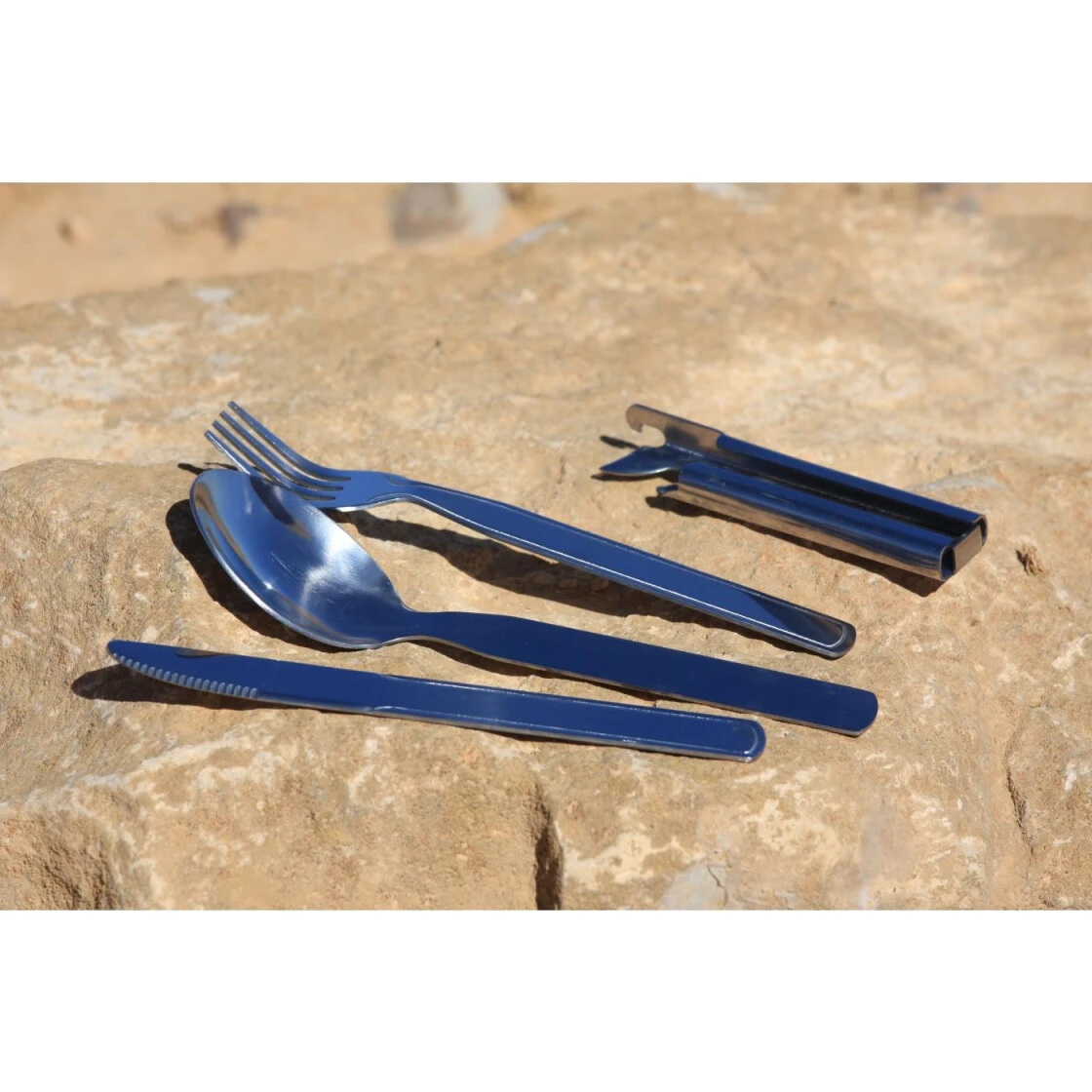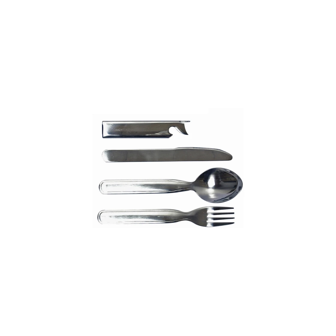 Einfaches Edelstahlbesteck von guter Qualität. In der Funktion dem Bundeswehrbesteck nachempfunden. Stabil, rostfrei, mit Dosen- und Flaschenöffner ausgestattet.