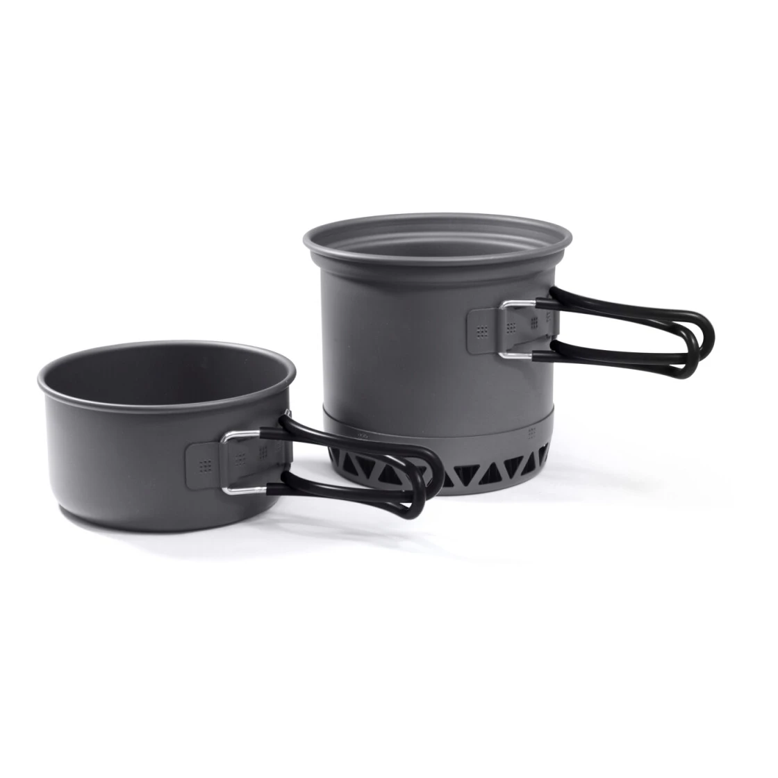 Das sehr leichte Topfset aus hartanodisiertem Aluminium ist mit einem hocheffizenten Wärmetauscher ausgestattet. Der Wärmetauscher spart Zeit beim Kochen und reduziert den Brennstoffverbrauch. Die stabilen Klappgriffe bieten sicheren Halt beim Kochen. Platzsparend verstaubar, erfolgt der Transport im praktischen Netzbeutel.