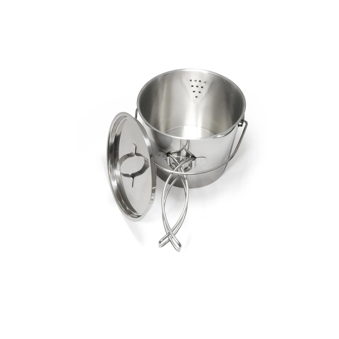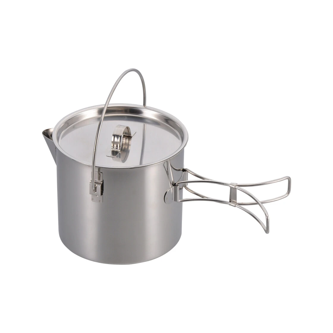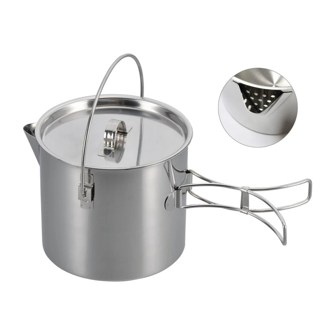 Leichter und robuster Teekessel und Kochtopf aus hochwertigem Edelstahl. Er verfügt über einen großen Henkel, Klappgriffe und einen groben Sieb im Ausguss. Durch die Klappgriffe lässt sich der Multitopf kompakt und platzsparend verstauen. In senkrechter Henkelposition werden Henkel und Deckel in dieser Position fixiert. Er kann sowohl am Henkel über dem offenen Feuer aufgehängt als auch mit dem Gaskocher oder der Herdplatte zu Hause benutzt werden. Darüber hinaus kann der Multitopf auch als Kochtopf für Nudeln, Reis oder Gemüse verwendet werden und das Wasser über die Ausgießöffnung abgegossen werden.