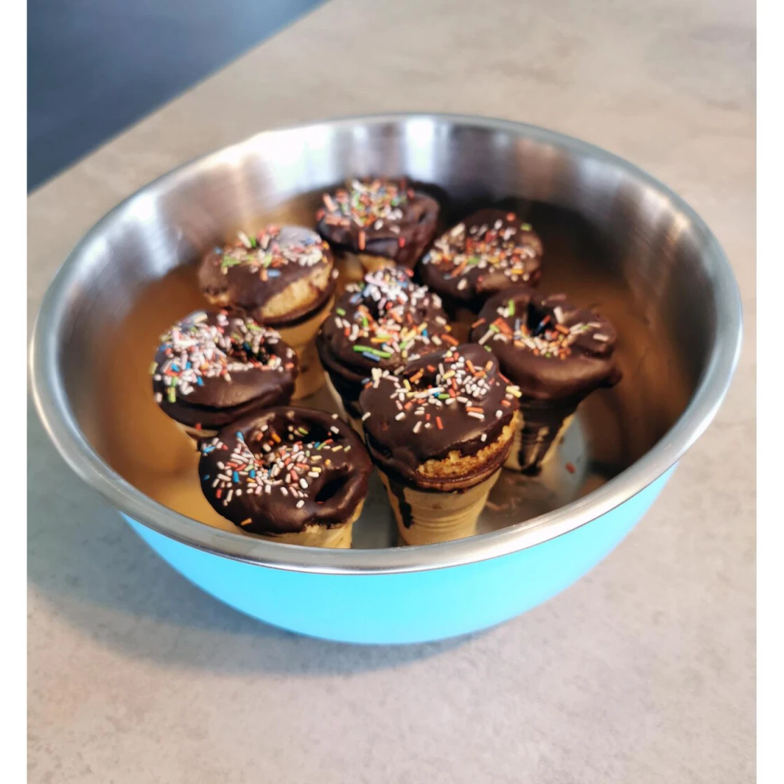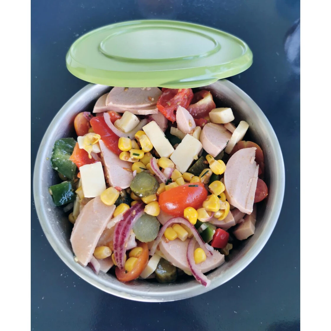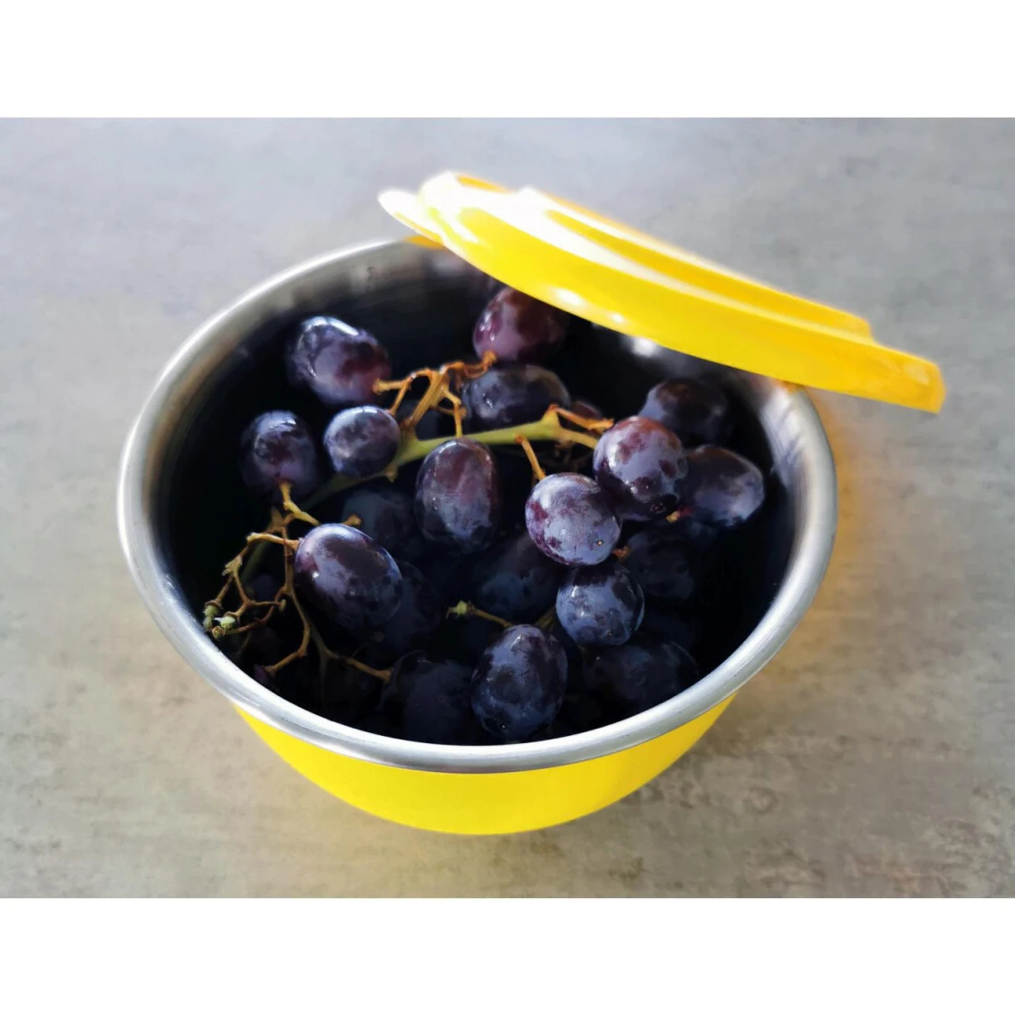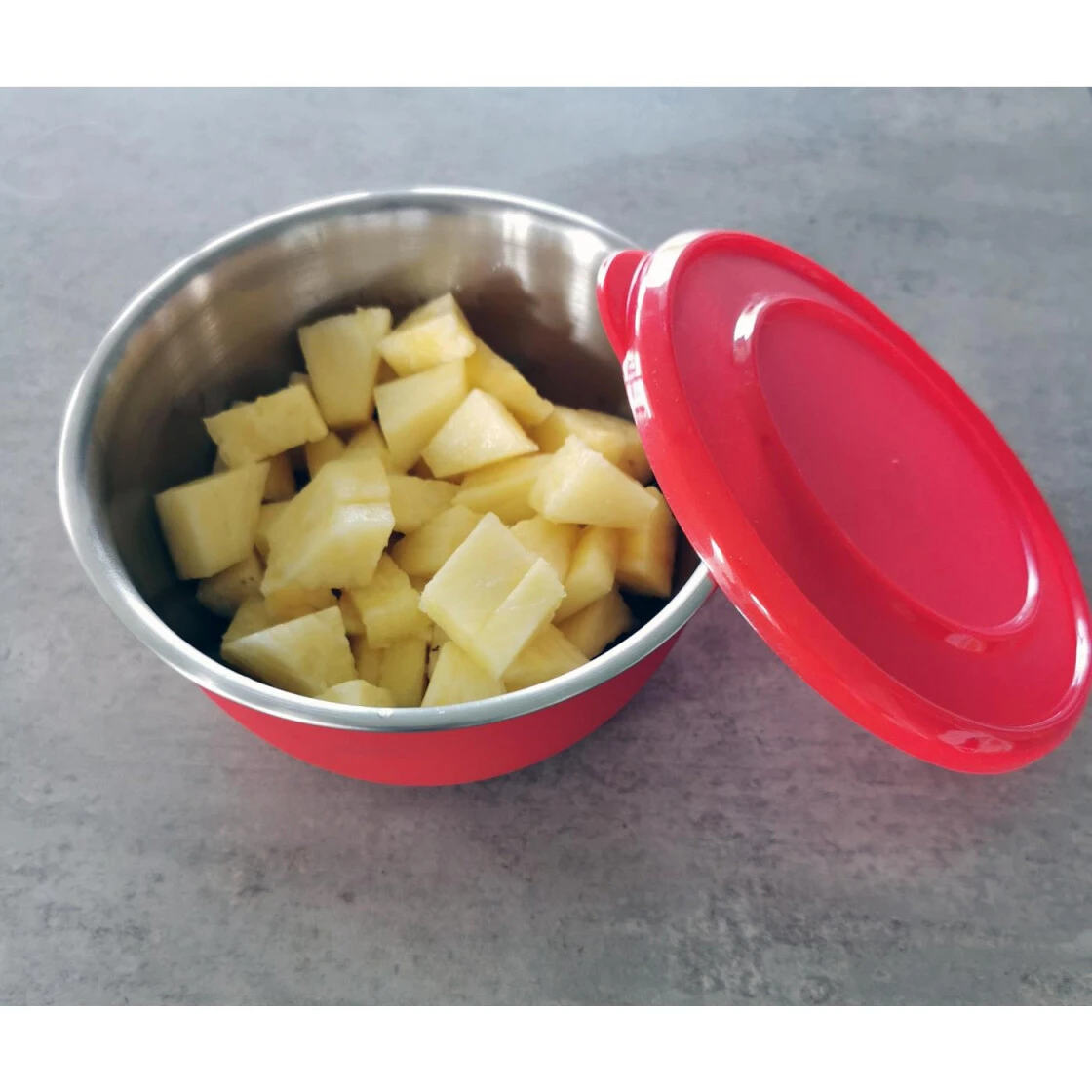 Edelstahlschüssel-Set in praktischen Größen 13 cm, 15 cm, 17 cm und 19 cm. Außen mit robuster Kunststoffhülle in verschiedenen Farben und innen aus rostfreiem Edelstahl. Diese sind im leeren Zustand stapelbar, platzsparend verstaubar, gefrier- und spülmaschinenfest. Ausgestattet mit passendem Kunststoffdeckel.