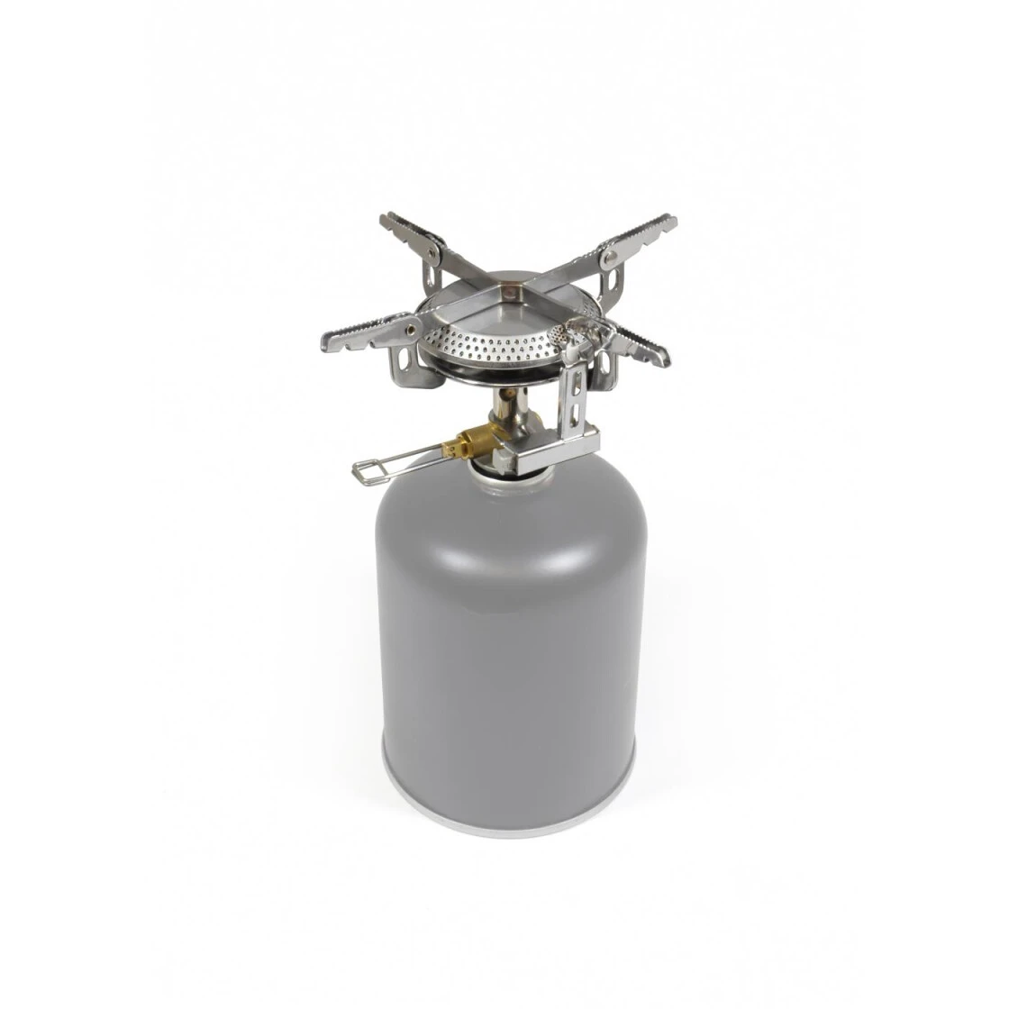 Edelstahl (3000 W) Gaskocher mit großen, klappbaren Topfträgern und Messingventil. Der leichte und kompakte Kocher ist für Schraubgasventil-Kartuschen verwendbar. Ausgestattet mit Piezozündung und Packsack. Ideal für Rucksacktouren und den allgemeinen Campinggebrauch.
