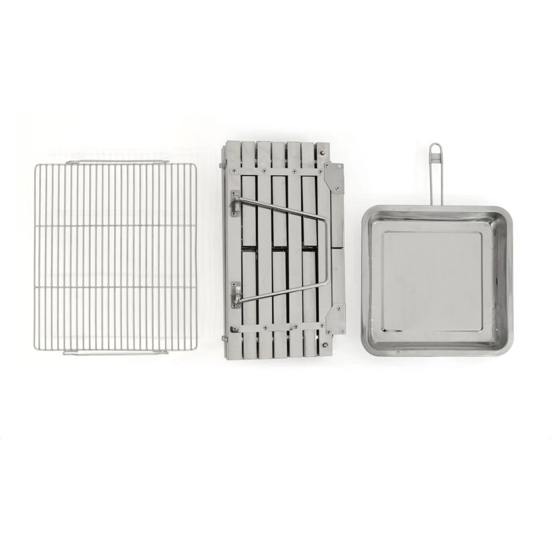 Sehr robuster Klappgrill aus Edelstahl, der auch als Feuerkorb verwendet werden kann. Der Grill verfügt über zwei Einschubhöhen für die Kohlenschale. Im unteren Einschub ist die Kohlenschale weiter vom Grillrost entfernt, wodurch die Hitzezufuhr reduziert wird. Der Grill kann so auch perfekt als Feuerkorb verwendet werden. Wird die Schale oben eingesetzt, ist die Glut dem Grillgut nahe und gart dieses schneller durch. Der Grill lässt sich schnell und unkompliziert aufbauen. Einfach aufklappen und die Seitenstreben mit den Stiften arretieren. Die ausklappbaren Beine werden über einen Einrastmechanismus fixiert und garantieren einen sehr stabilen Stand. Nun nur noch den Grillrost in die Streben der Griffe auflegen und schon ist der Grill einsatzbereit. Sein offenes Design sorgt für eine optimale Luftzufuhr und der Grillrost bietet ausreichend Fläche für das heiß begehrte Grillgut. Durch seine praktische Bauweise trägt der Grill erheblich zum Grillvergnügen bei, egal ob beim Camping oder auf dem Festival. Die Tragetasche aus Nylon ist im Lieferumfang enthalten.