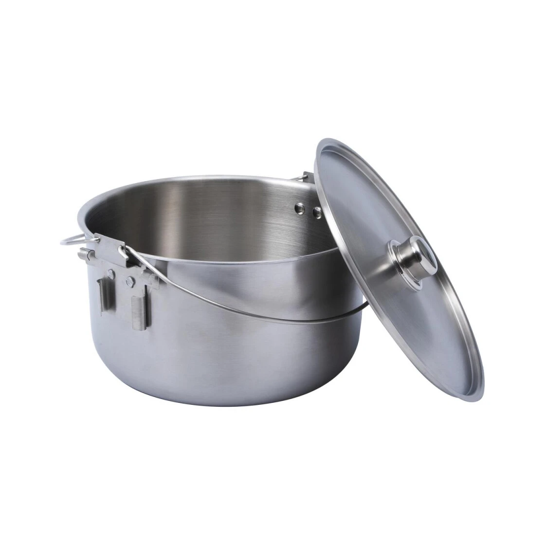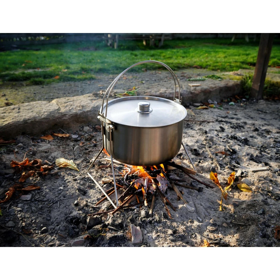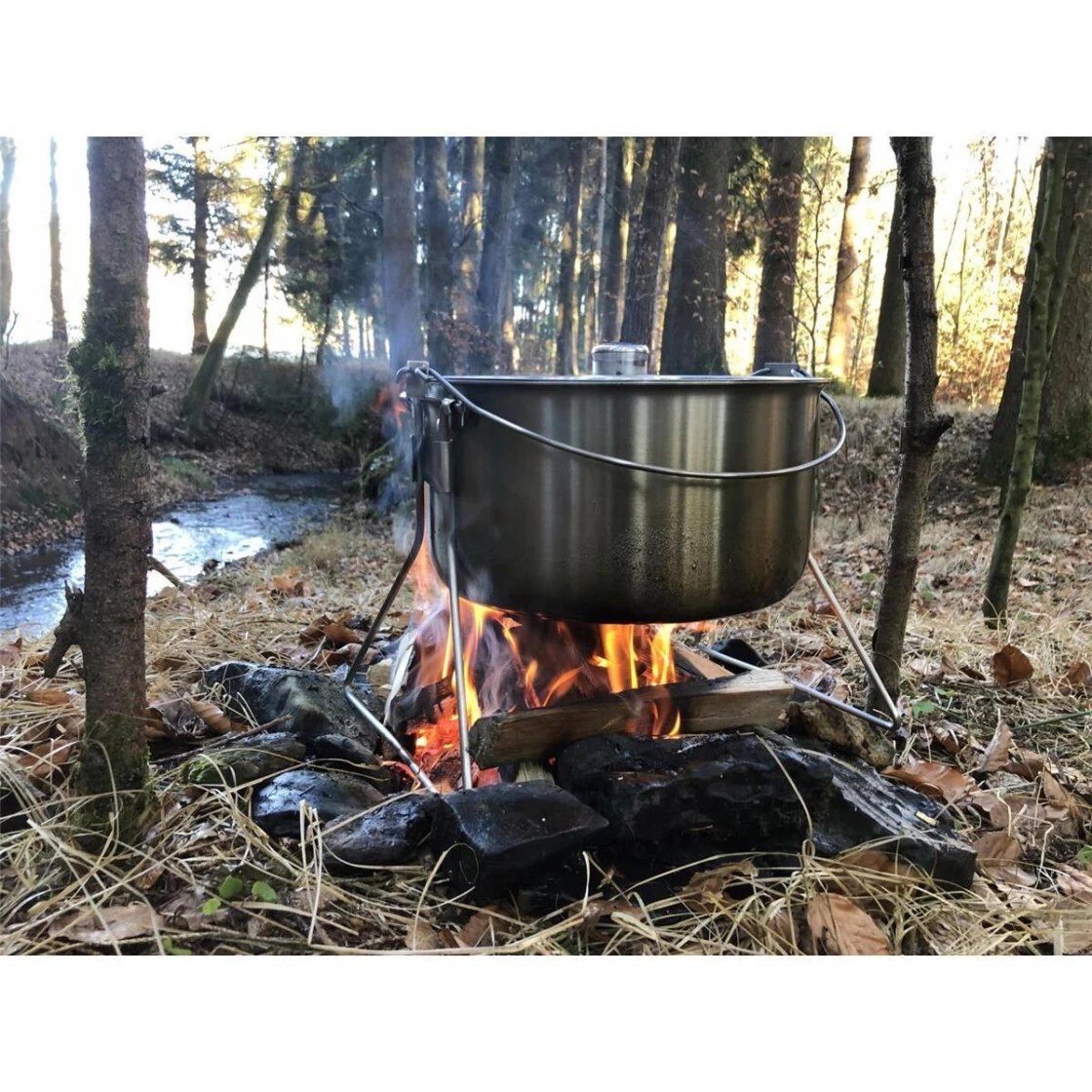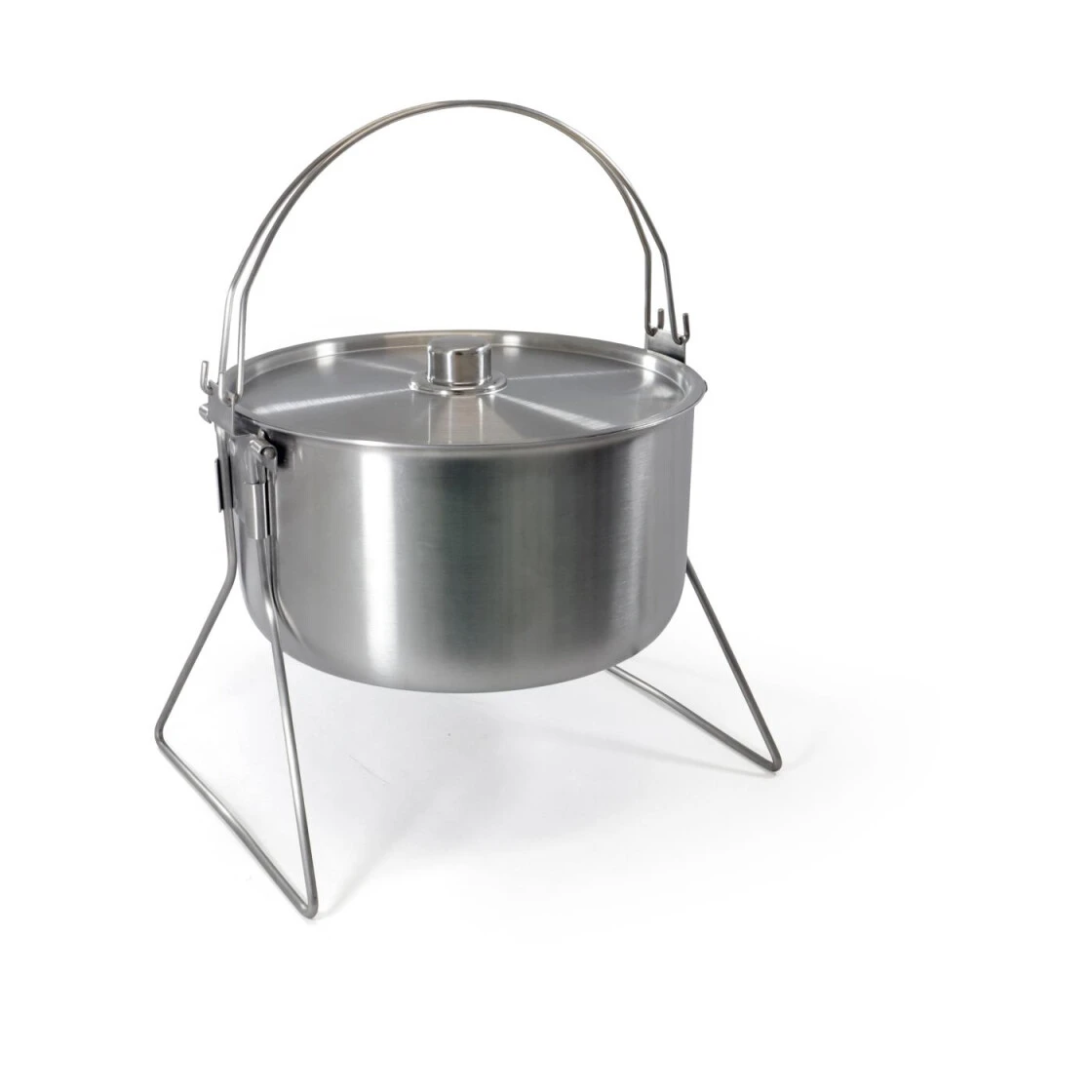 Der Hordentopf bietet ausreichend Volumen für das Ferienlager, das zünftige Biwak oder die Gartenparty. Gefertigt aus hochwertigem Edelstahl zeichnet er sich dennoch durch relativ geringes Gewicht aus. Die zwei außerhalb des Schwerpunktes angebrachten Henkel bieten beim Tragen und am Dreibein sicheren Halt. Ausgerüstet mit den mitgelieferten Standbeinen kann der Topf über einen Kocher oder ein Feuer gestellt werden. Somit ist der Topf für jede erdenkliche Kochstelle geeignet, vom Induktionsherd bis zum Lagerfeuer.