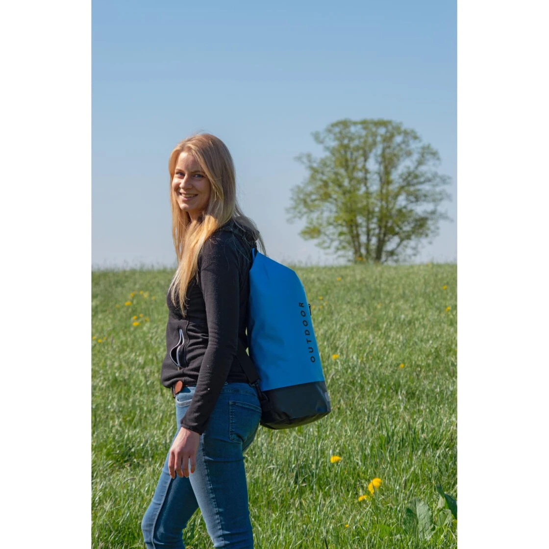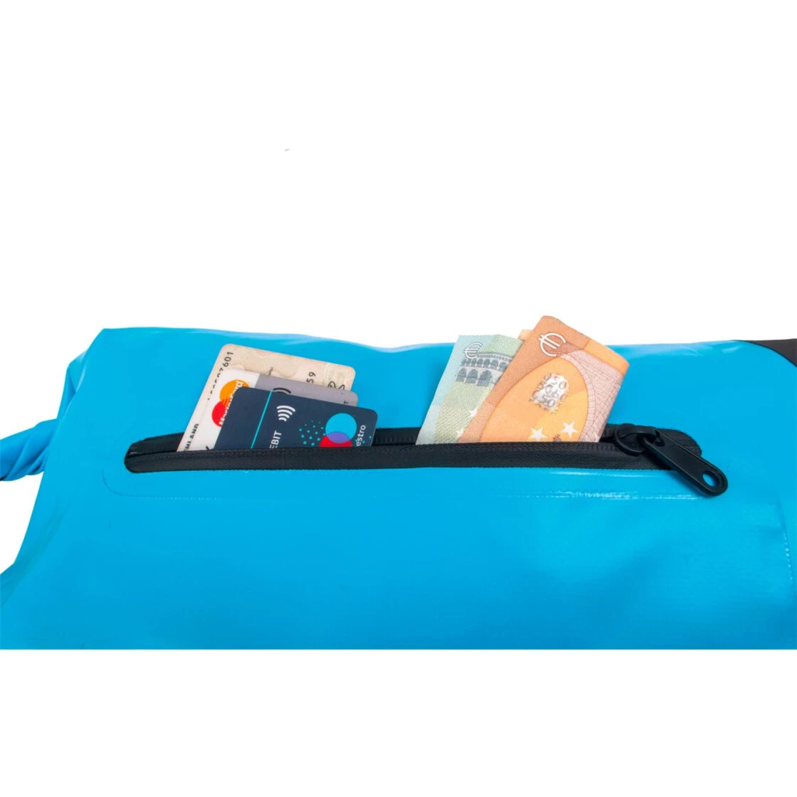 Extrem robuster und wasserdichter Packsack. An der Außenseite befindet sich ein spritzwassergeschütztes Reißverschlussfach zum Verstauen von kleinen Dingen wie Smartphone, Schlüssel oder Geldbeutel. Darüber hinaus kann er auch als Rucksack verwendet werden, da dieser mit zwei verstellbaren und abnehmbaren Schultergurten ausgestattet ist. Einfache Verschließung durch Umschlagen der Öffnungsleiste und Verbinden der Verschlussenden. Der Packsack kann an zwei D-Ringen mit einem zusätzlichen Schloss versehen werden. Mit Reflektionsstreifen.