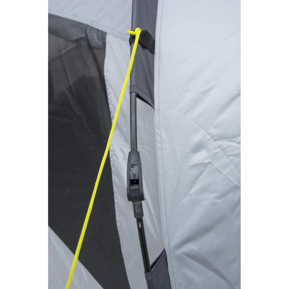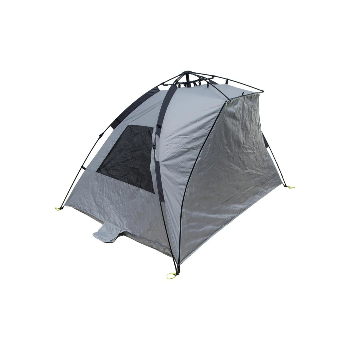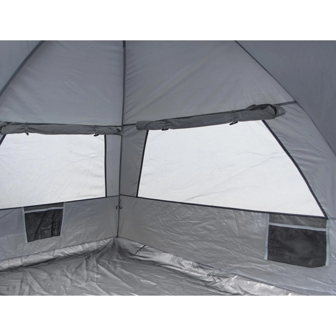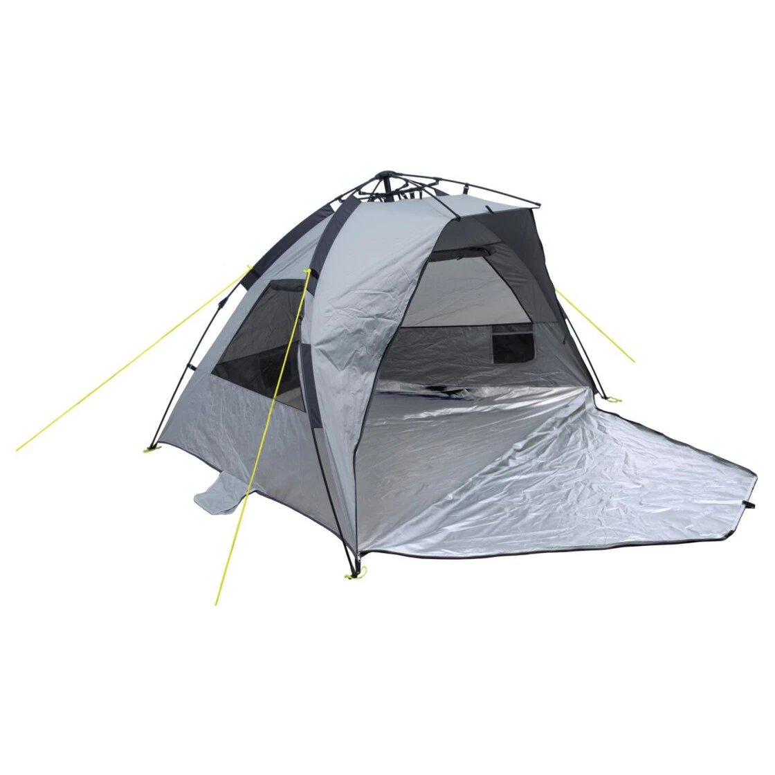 Eine geräumige Strandmuschel aus silberbeschichtetem Polyester mit USF 50+ Sonnenschutz. Durch das Automatikgestänge ist das Auf- und Abbauen problemlos möglich. Drei von innen verschließbare Netzfenster sorgen für einen schönen Rundumblick und eine gute Belüftung. Benötigt man etwas Privatsphäre, so kann der Eingang mit dem vorne überstehenden Teil an den seitlich angebrachten Reißverschlüssen geschlossen werden. Geöffnet wiederum hat man eine große Fläche, um bequem darauf liegen zu können. Für die Ausleuchtung des Innenraums bei Dunkelheit kann eine Lampe an den mittig angebrachten Lampenhaken aufgehängt werden. Zum sicheren Verstauen von kleinen Utensilien wie dem Handy oder der Strandlektüre sind im Inneren 3 bodenferne Innentaschen angebracht. Die Außentaschen können mit Sand oder Steinen beschwert werden. Die mitgelieferten Abspannleinen halten die Strandmuschel auch bei starkem Wind an Ort und Stelle. Die Tragetasche ist mit Reißverschluss und Trageriemen ausgestattet. Abspannleinen und Heringe sind im Lieferumfang enthalten.