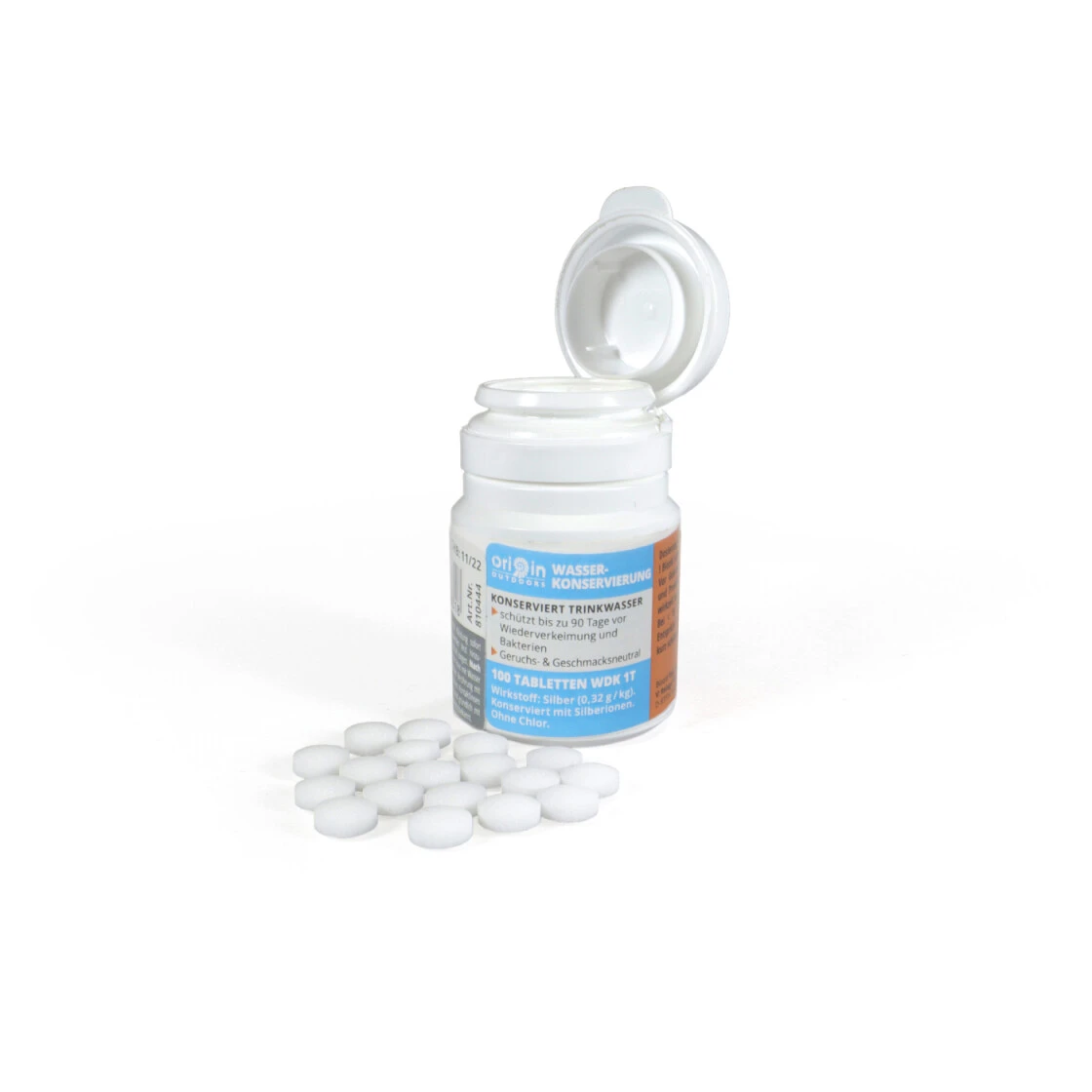Tabletten zur einfachen Konservierung von klarem Trinkwasser. Diese funktioniert auf Silberionenbasis. Schützt vor Wiederverkeimung und Bakterien bis zu 90 Tage. Ideal für die Anwendung bei Trinkwasser, in Wassertanks, Großbehältern, und vielem mehr. Behandelt 100 Liter pro Packung (1 L pro Tablette).