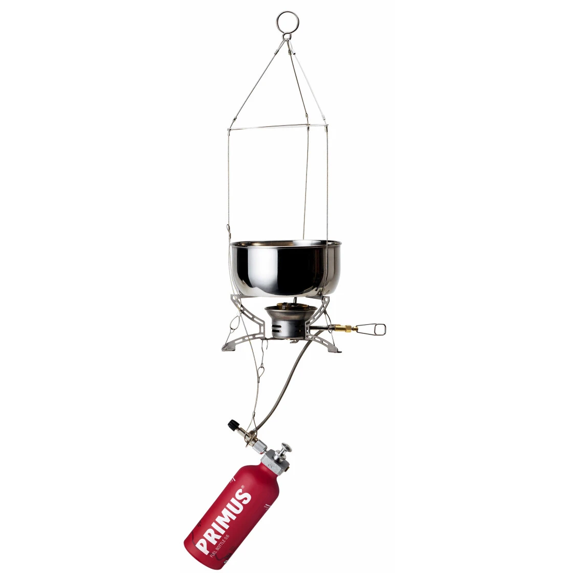 Mit diesem Set können Sie die Primuskocher und die passende Gaskartusche/Brennstoffflasche aufhängen. Dies hilft beim Biwak in der Felswand, auf dem Boot oder bei anderen Gelegenheiten den Kocher sicher zu befestigen. Die Spannseile erlauben trotzdem einen guten Zugriff zum Topf (und dessen Inhalt).