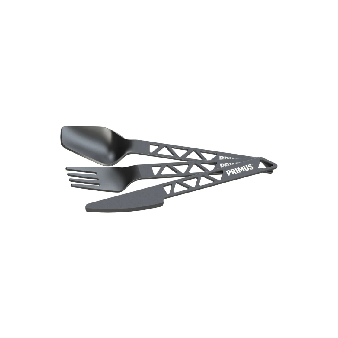 Messer, Gabel und Löffel aus hart anodisiertem Aluminium. Dieses Set bietet niedriges Gewicht bei langer Haltbarkeit. Mit praktischem Packriemchen.