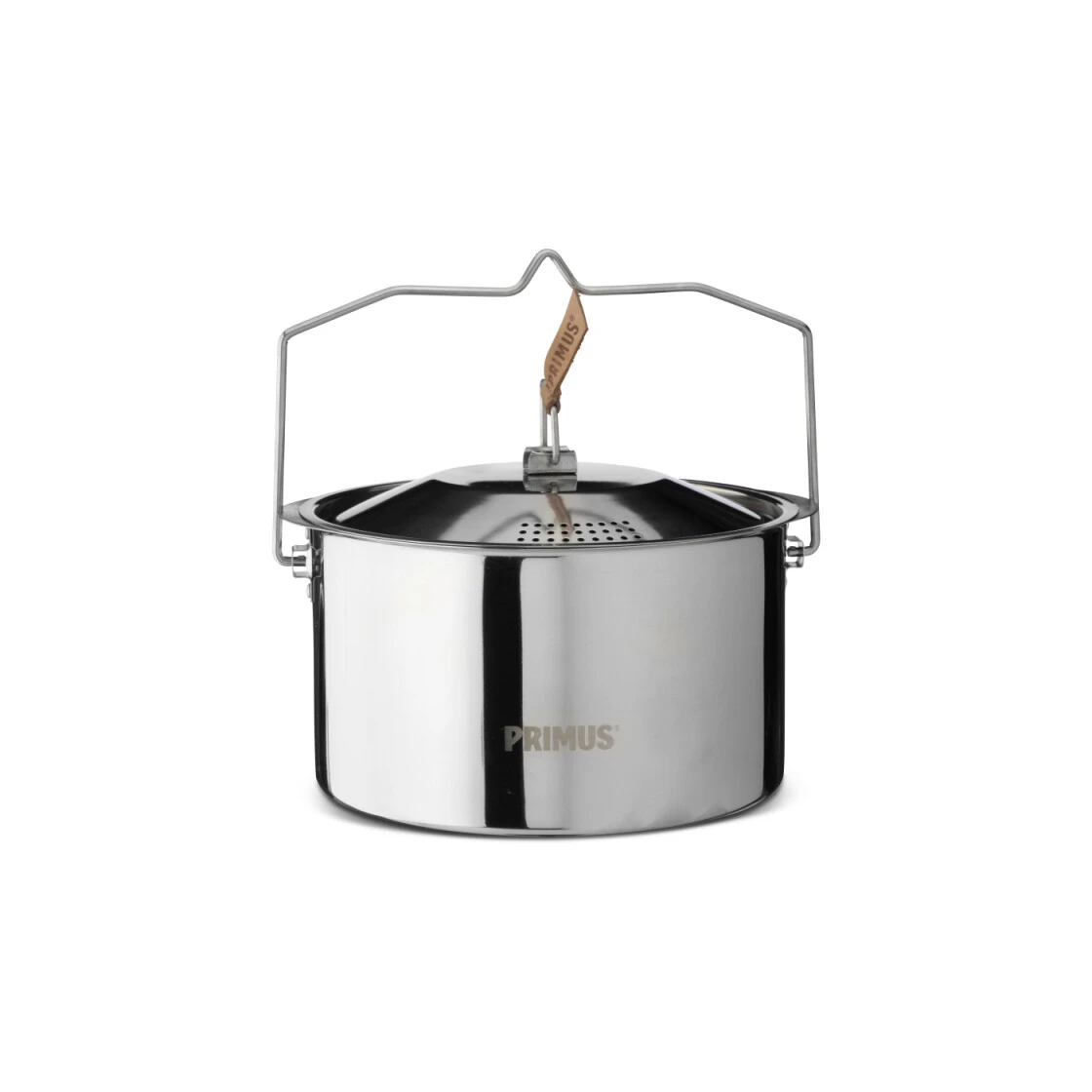 Robuster Topf aus 18/8-Edelstahl mit Klappgriff aus Metall und Metalldeckel, geeignet für die Verwendung über offenem Feuer. Der perfekte Topf für den Gourmet-Koch oder das große Abenteuer. Tasche im Lieferumfang enthalten.