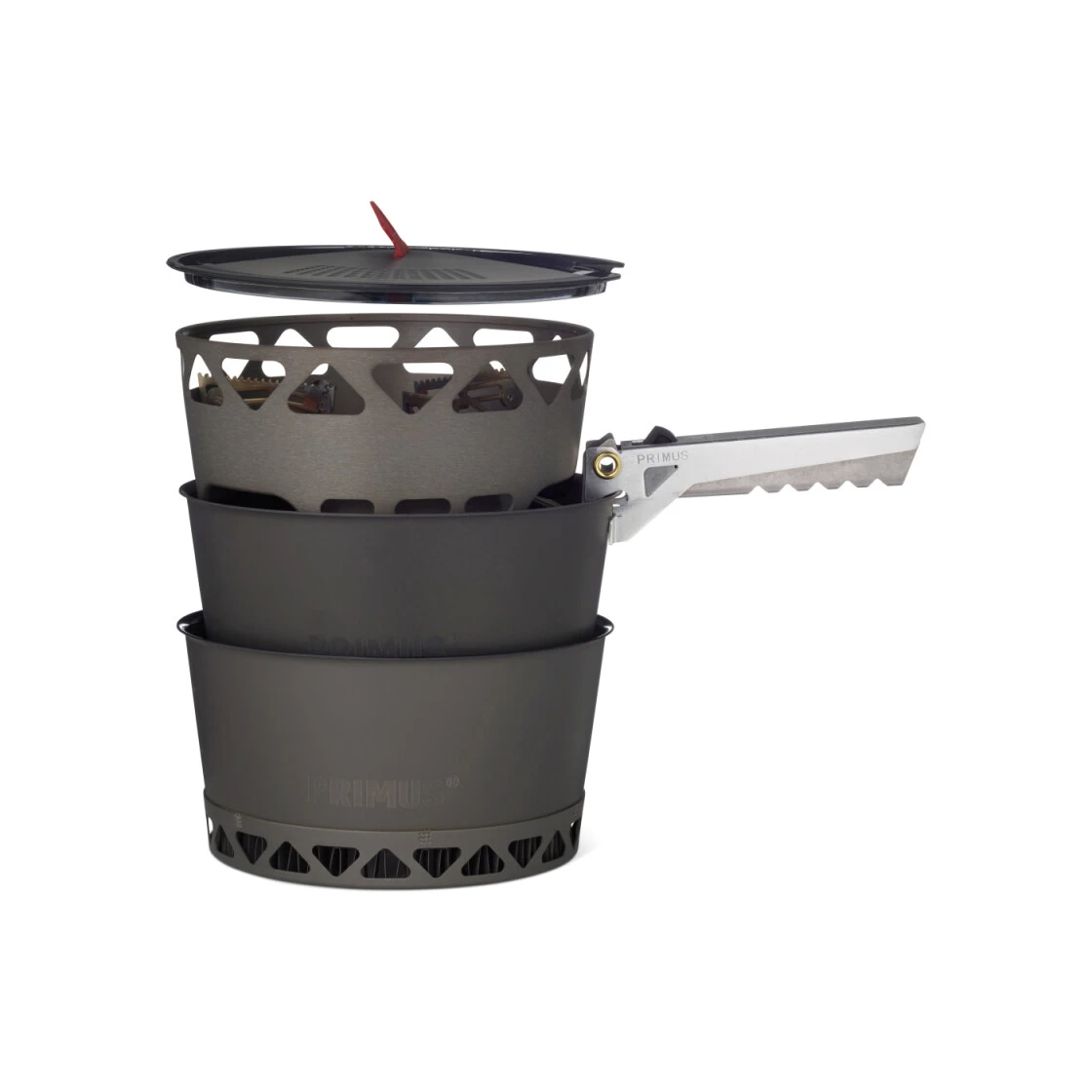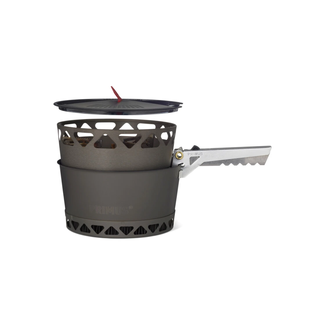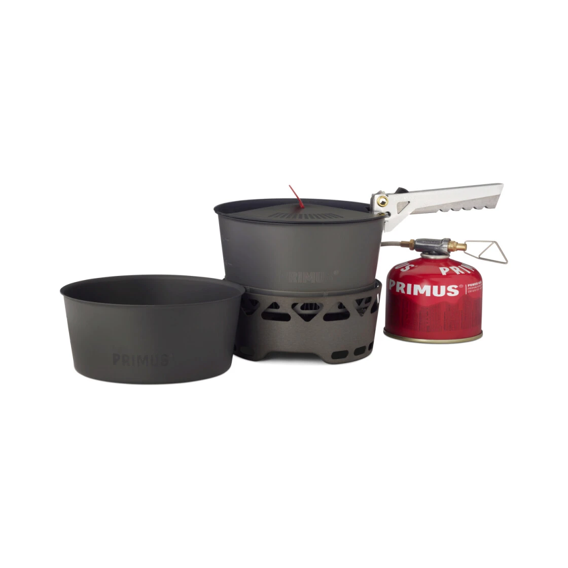 Hier ist der Gasbrenner in den Windschutz integriert, was den Kocher sehr stabil macht. Leicht zusammen zu bauen und schnell einsatzbereit. Mit relativ leisem Brenner. Die Töpfe aus hart eloxiertem Aluminium sind sehr wärmeleitfähig und einer davon ist mit dem speziellen Wärmeleitsystem für beste Kochzeiten ausgestattet. Dieser Topf hat außerdem eine keramische Innenbeschichtung zum einfachen Kochen und Pflegen. Der transparente Deckel hat eine praktische Siebfunktion.