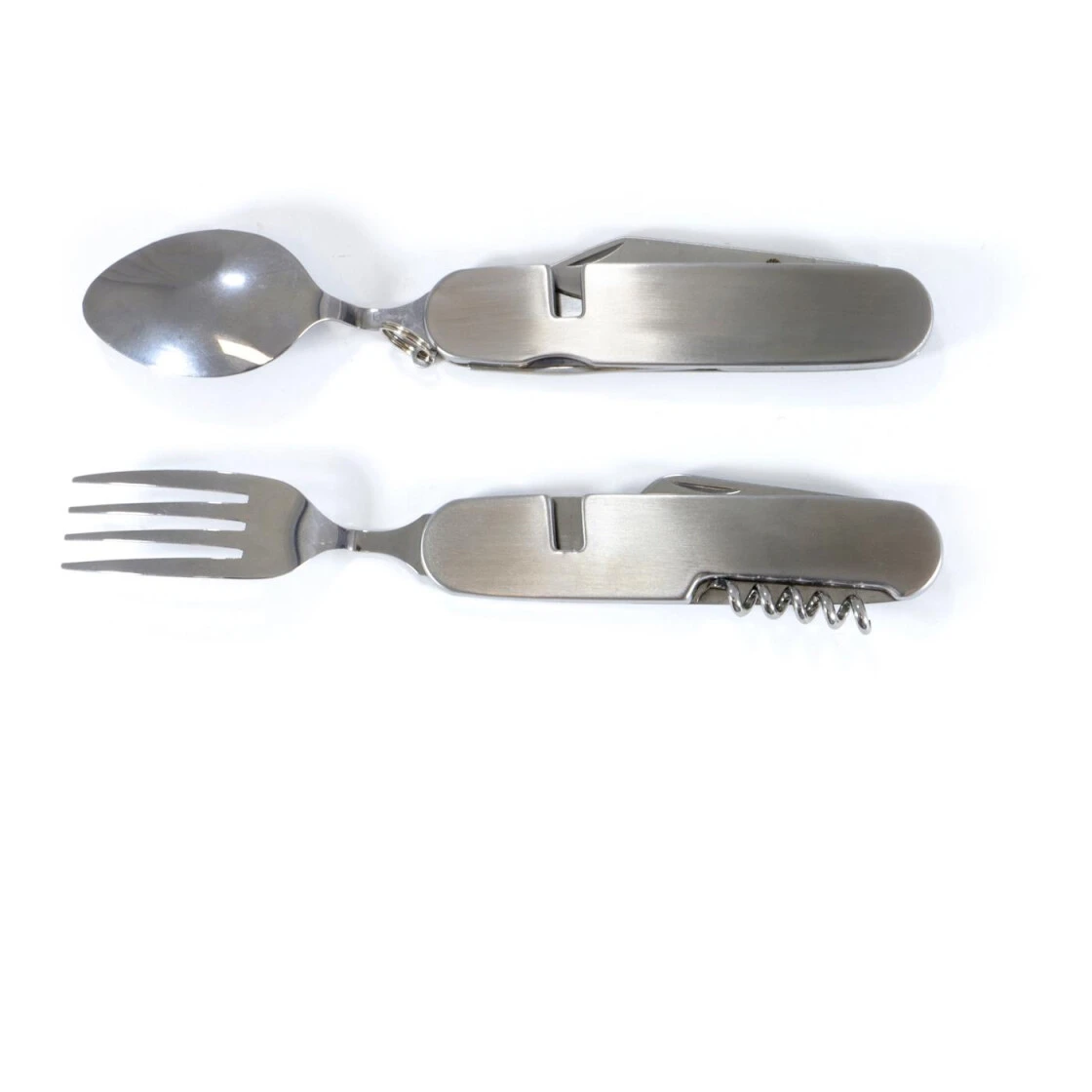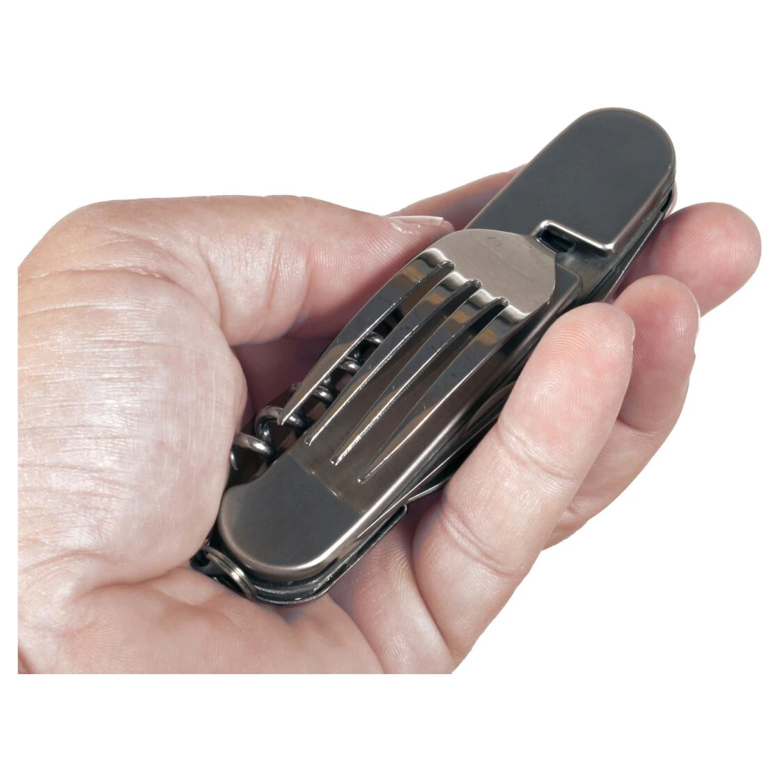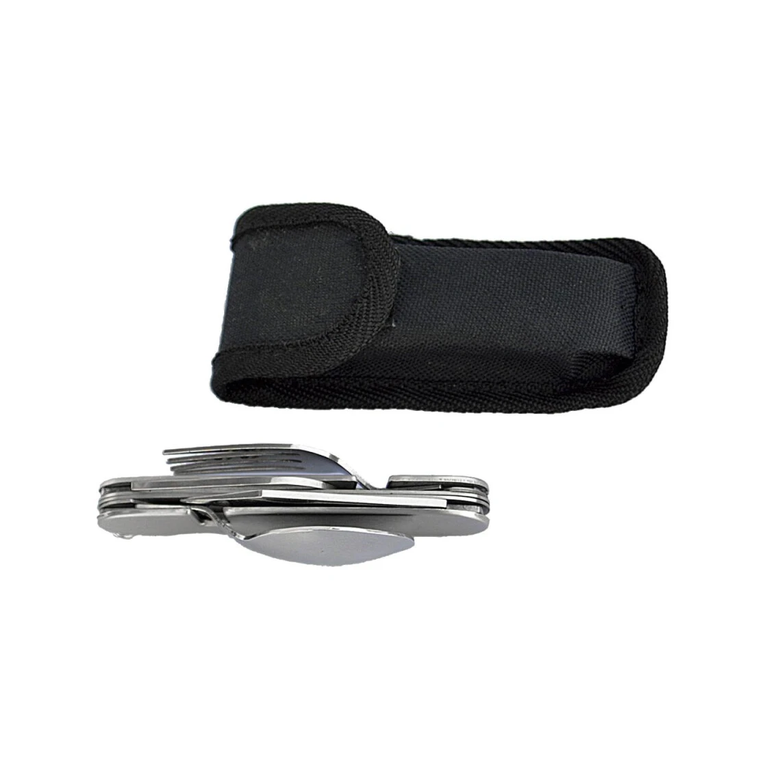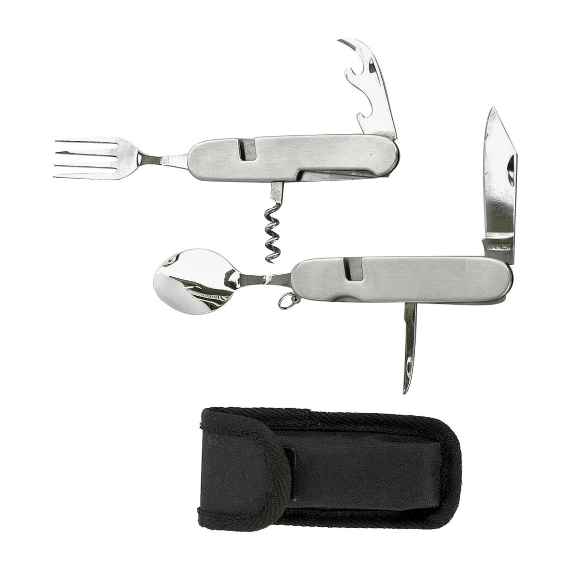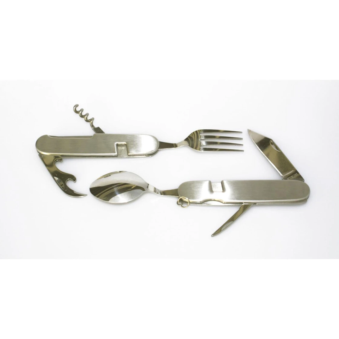 Trennbares und kompaktes Edelstahlbesteck in schwerer Qualität. Durch Öffnen des Löffels bzw. der Gabel werden die beiden Schalen entriegelt und man hat ein komplettes Besteck inklusive Messer, Dosenöffner, Ahle und Korkenzieher. Kommt im schwarzen Nylonetui.