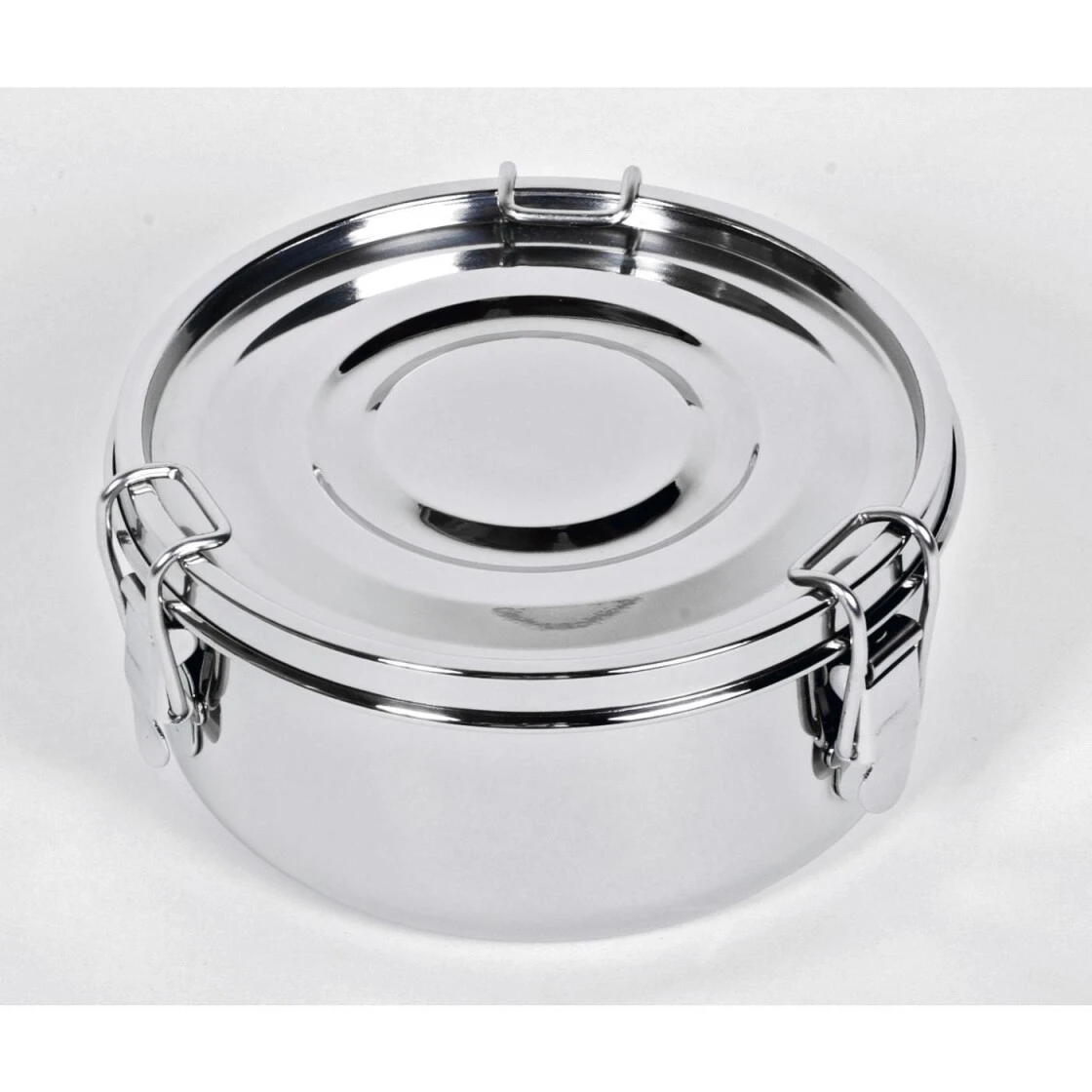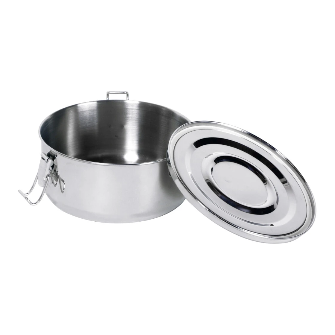 Essensbehälter aus Edelstahl in 3 verschiedenen Größen. Der Deckel, der mit 3 Verschlüssen auf dem jeweiligen Behälter befestigt werden kann, hat eine Dichtung und ist so spritzwassergeschützt. Bestens geeignet für Brotzeit, vorgekochte Mahlzeiten, Vorratshaltung, Campingküche oder Outdoorevent. Macht auch Zuhause und bei der Gartenparty eine gute Figur. Kann auch auf Flammenkochern eingesetzt werden (Aber nur OHNE Deckel).