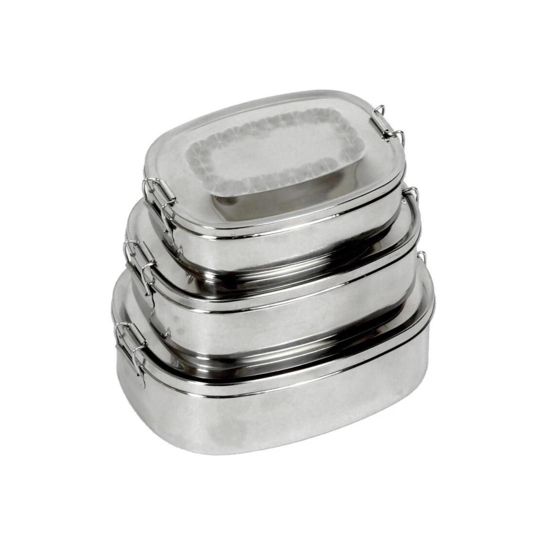 Praktische Proviantdose aus Edelstahl. Der Deckel wird mit 2 Rollklammern auf der Dose gehalten. Perfekt für Brote, Obst oder Proviant. Aber auch für Kleinzeug, Fotozubehör, Erst-Hilfe-Sets, als Spardose oder für das Schuhputzzeug geeignet. Kann zur Not auf Flammenkochern benutzt werden – dann den Deckel nicht befestigen. Ohne Dichtung.