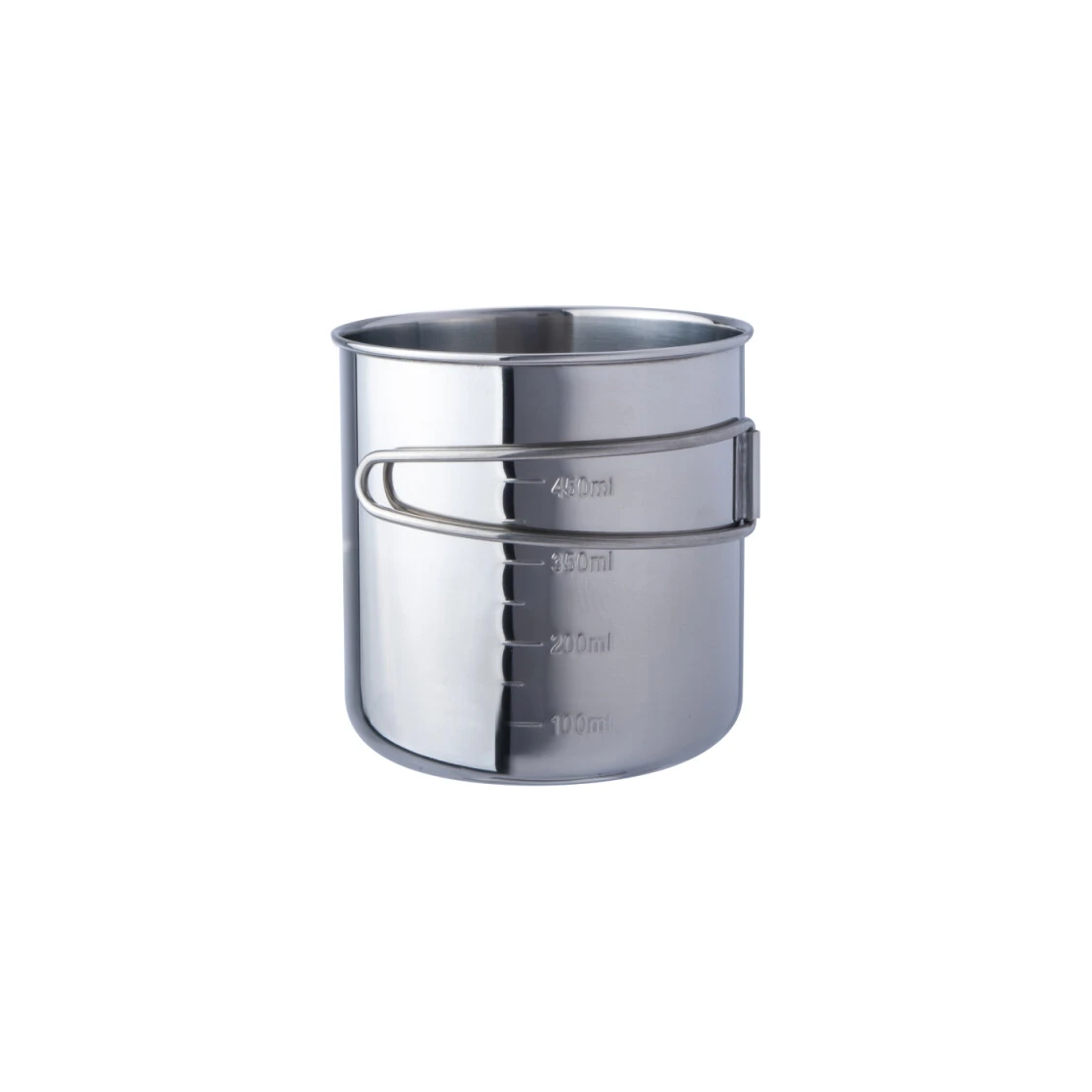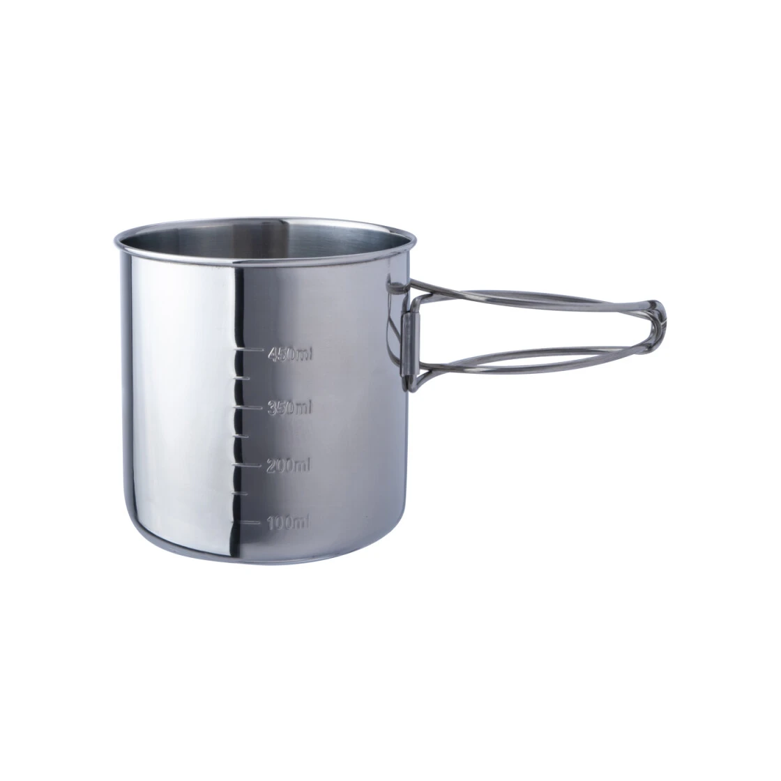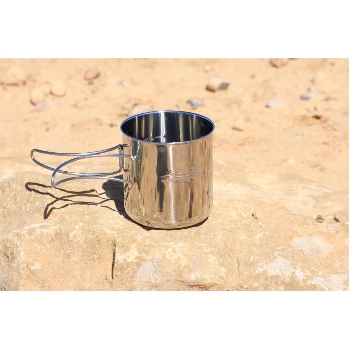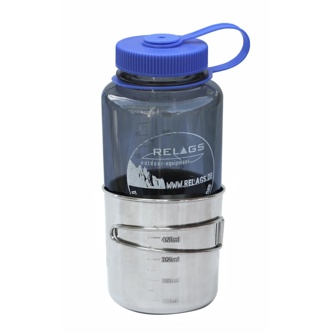 Edelstahlbecher mit praktischen, sehr langen Klappgriffen. Der Becher ist universell einsetzbar bei Touren oder in der Outdoorküche. Der Innendurchmesser ist so gewählt, dass der Becher zum Transport über eine Nalgene 1 Liter Flasche geschoben werden kann. Man spart dadurch enorm Raum im Gepäck. Der Inhalt des ‚Space Safers‘ ist an die Portionsgrößen für Trockengerichte von 125 g angepaßt. Diese werden mit 350 ml aufgegossen. Der Becher hat max. 600 ml Volumen, so dass man die Portion auch noch gut umrühren kann. Mit Meßskala.