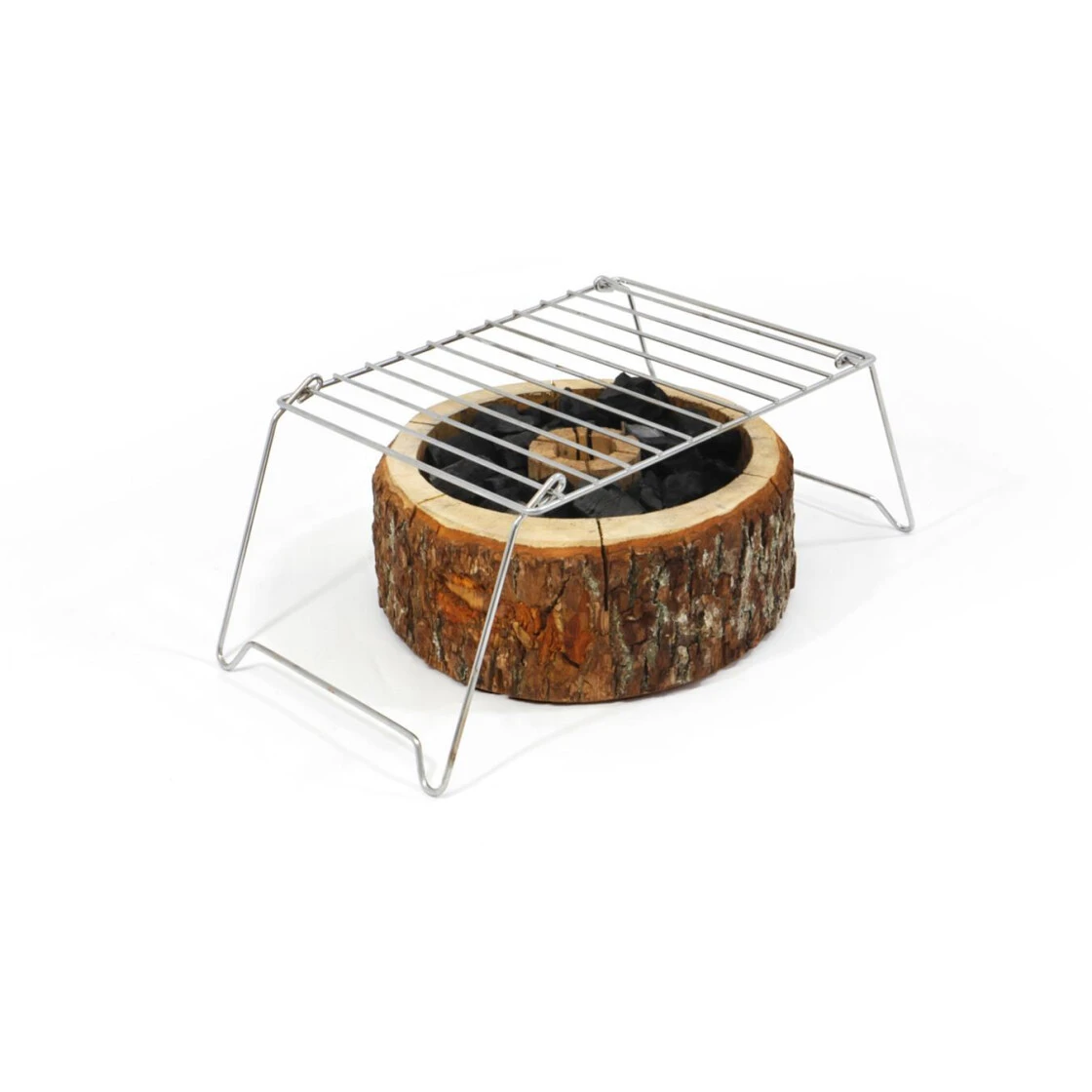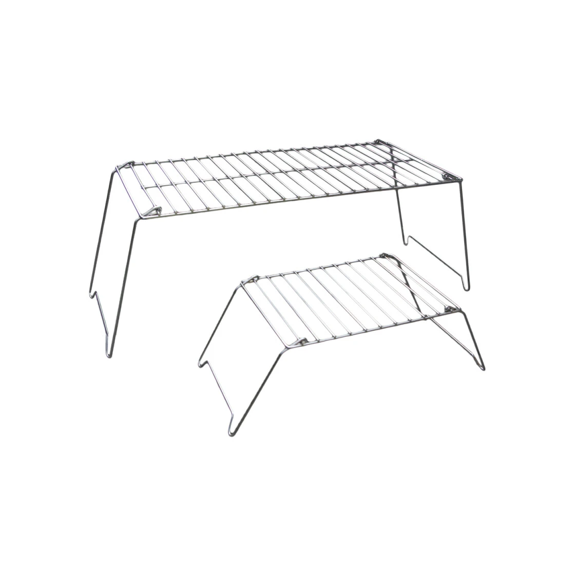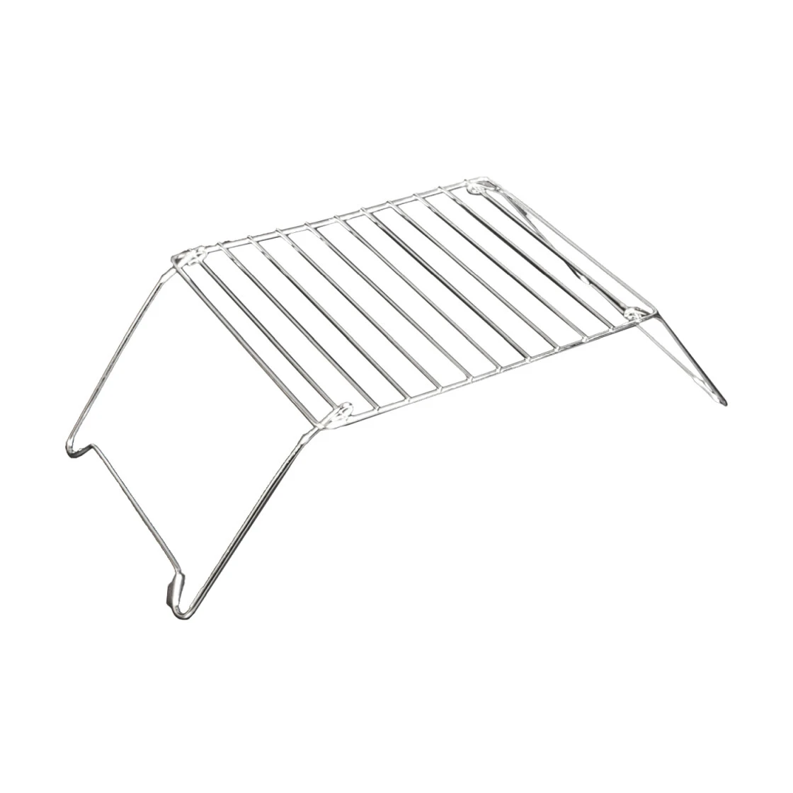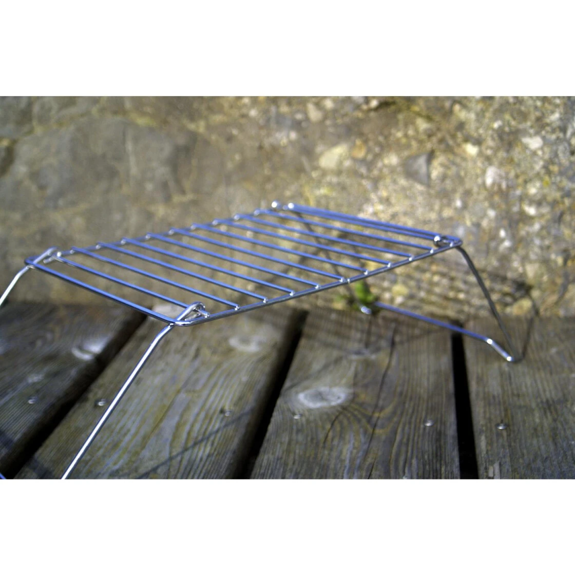Kleiner, zusammenlegbarer Campinggrill, den man ohne Gewissensbisse ins Feuer schicken kann. Ohne scharfe Kanten und Ecken. Reicht aus für 2 große Steaks oder mehrere Würste. Sehr gute Verarbeitung, verchromt.