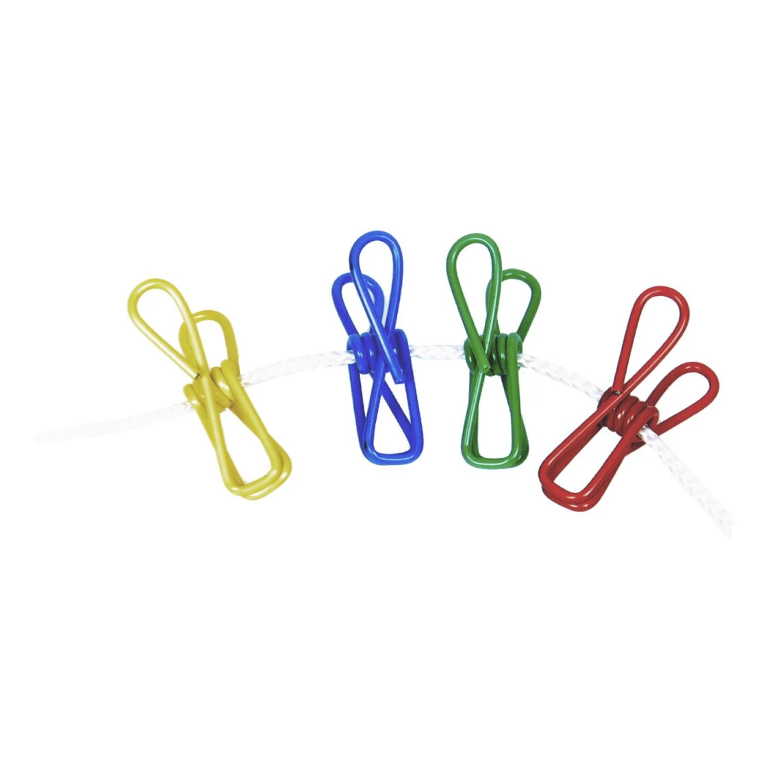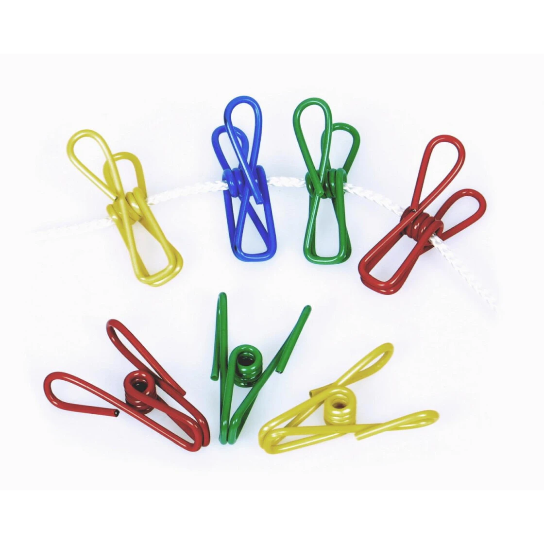 Stabile, unzerbrechliche Wäscheklammern aus Metall, kunststoffbeschichtet, für die große Wäsche unterwegs. Die Klammern können an allen Seilen benutzt werden. Alternativ können Sie die Klammern an einem Seil auffädeln (sicherer Transport, kein Gefummel) oder einzeln an Haken und Nägeln benutzen und so fehlende Aufhänger ersetzen! Einfach praktisch.
